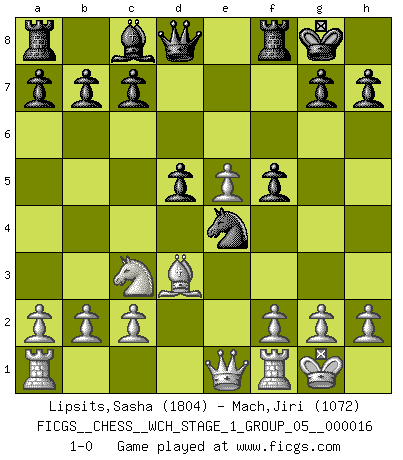 Last move : 1-0 2016 June 18 11:11:10 [Event "FICGS__CHESS__WCH_STAGE_1_GROUP_05__000016"] [Site "FICGS"] [Date "2016.03.02"] [Round "1"] [White "Lipsits,Sasha"] [Black "Mach,Jiri"] [Result "1-0"] [WhiteElo "1804"] [BlackElo "1072"] 1.e4 e5 2.Nf3 Nf6 3.Nxe5 d6 4.Nf3 Nxe4 5.d4 d5 6.Bd3 Nc6 7.O-O Be7 8.Nc3 f5 9.Bf4 O-O 10.Ne5 Nxe5 11.Bxe5 Bd6 12.Qe1 Bxe5 13.dxe5 1-0 This chess game has been lost on time (started : 2016.03.02 2:9:49) Petrov : Classical attack Kingside Castling by player White (move 7) Kingside Castling by player Black (move 9) Player White won this chess game. Follow this game move after move (download)He who fears an isolated Queen's Pawn should give up Chess. (Siegbert Tarrasch) Das Zentrum ist der Balkan des Schachbretts - Kriegshandlungen können in jedem Moment ausbrechen. (Aaron Nimzowitsch) Debes de llevar a tu oponente hacia un profundo y obscuro bosque donde 2+2=5, y el camino que conduce a la salida es suficientemente ancho para solamente uno. (Mikhail Tal) La solitude du joueur d'Echecs à l'approche du mat est semblable à celle du condamné. (Francis Szpiner) Wawaweewa ! (Borat: Cultural learnings of America for make benefit glorious nation of Kazakhstan)