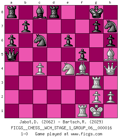 Last move : 1-0 2016 April 9 9:30:38 [Event "FICGS__CHESS__WCH_STAGE_1_GROUP_06__000016"] [Site "FICGS"] [Date "2016.03.02"] [Round "1"] [White "Jabot,Daniel"] [Black "Bartsch,Reinhard Andrea"] [Result "1-0"] [WhiteElo "2062"] [BlackElo "2029"] 1.e4 c5 2.Nf3 d6 3.d4 cxd4 4.Nxd4 Nf6 5.Nc3 a6 6.Bg5 e6 7.f4 Qb6 8.Qd2 Qxb2 9.Rb1 Qa3 10.e5 dxe5 11.fxe5 h6 12.Bh4 Nfd7 13.Ne4 Qxa2 14.Rd1 Qd5 15.Qe3 Qxe5 16.Be2 Bc5 17.Bg3 Qd5 18.c4 Bxd4 19.Rxd4 Qa5+ 20.Rd2 O-O 21.Bd6 Rd8 22.O-O Nc6 23.Qf4 Qf5 24.Qh4 Qa5 25.Rd3 Nf8 26.Bh5 f5 27.Rg3 Nh7 28.Bf4 1-0 Sicilian : Najdorf, 7...Qb6 Kingside Castling by player Black (move 20) Kingside Castling by player White (move 22) Player White won this chess game. Follow this game move after move (download)Half the variations which are calculated in a tournament game turn out to be completely superfluous. Unfortunately, no one knows in advance which half. (Jan Tinman) Über Karpov: Er war und ist ein Vertreter der russischen Reaktionäre. Das steckt tief in seiner Seele, wehalb ich nicht nett mit ihm umgehen kann. (Viktor Kortschnoi) ¿Se han dado cuenta de que Fischer casi nunca ha tenido piezas malas? El las intercambia y las piezas malas se quedan con sus oponenets. (Yuri Balashov) Les échecs sont un jeu par leur forme, un art par leur essence et une science par sa difficulté d'acquisition. Ils peuvent vous procurer autant de plaisir qu'un bon livre ou une belle musique, mais vous n'aurez une réelle joie que si vous arrivez à bien jouer. (Tigran Petrosian) When you have everything, sometimes it feels like nothing. (Horatio Caine, C.S.I. Miami)