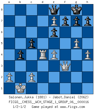 Last move : 1/2-1/2 2016 April 15 11:7:52 [Event "FICGS__CHESS__WCH_STAGE_1_GROUP_06__000016"] [Site "FICGS"] [Date "2016.03.02"] [Round "1"] [White "Salonen,Jukka"] [Black "Jabot,Daniel"] [Result "1/2-1/2"] [WhiteElo "1881"] [BlackElo "2062"] 1.e4 c5 2.Nf3 d6 3.d4 cxd4 4.Nxd4 Nf6 5.Nc3 a6 6.Bg5 e6 7.f4 Qb6 8.Nb3 Be7 9.Qf3 Nbd7 10.O-O-O Qc7 11.Bd3 b5 12.Kb1 b4 13.Bxf6 Nxf6 14.Ne2 O-O 15.g4 Bb7 16.Rhg1 Nd7 17.g5 Nc5 18.Nxc5 dxc5 19.Bc4 Rad8 20.h4 a5 21.b3 a4 22.bxa4 Rxd1+ 23.Rxd1 Bc6 24.Qb3 Qa5 25.f5 Bxa4 26.Qf3 Bb5 27.Bxb5 Qxb5 28.f6 Rd8 29.Nd4 Rxd4 30.fxe7 Qe8 31.Rxd4 1/2-1/2 Sicilian : Najdorf, 7...Qb6 Queenside Castling by player White (move 10) Kingside Castling by player Black (move 14) This chess game ended in a draw. Follow this game move after move (download)Pawns: they are the soul of this game, they alone form the attack and defense. (Philidor) Ein bischen Romantik kann weder im Schach noch in der Liebe schaden. Also versuche ich mich ab und zu daran zu erinnern. (Nigel Short) Aquellos que dicen entender al Ajedrez, no entienden nada. (Robert Hubner) Les sacrifices démontrent seulement que quelqu'un a gaffé. (Savielly Tartacover) True nature is revealed in times of difficulty. (Chinese proverb)