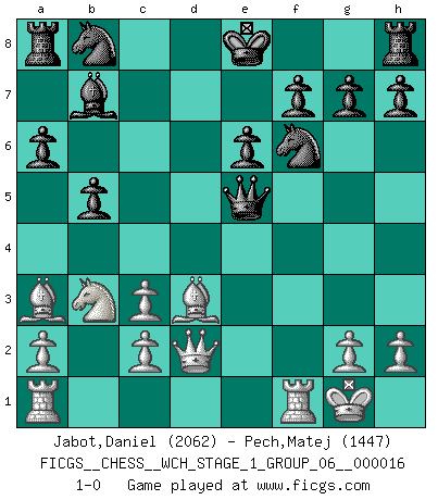 Last move : 1-0 2016 June 18 11:11:10 [Event "FICGS__CHESS__WCH_STAGE_1_GROUP_06__000016"] [Site "FICGS"] [Date "2016.03.02"] [Round "1"] [White "Jabot,Daniel"] [Black "Pech,Matej"] [Result "1-0"] [WhiteElo "2062"] [BlackElo "1447"] 1.e4 c5 2.Nf3 e6 3.d4 cxd4 4.Nxd4 a6 5.Nc3 Qc7 6.Bd3 Nf6 7.f4 Bb4 8.Nb3 Bxc3+ 9.bxc3 d6 10.Ba3 b5 11.O-O Bb7 12.e5 dxe5 13.fxe5 Qxe5 14.Qd2 1-0 This chess game has been lost on time (started : 2016.03.02 2:9:50) Sicilian : Kan, 5.Nc3 Kingside Castling by player White (move 11) Player White won this chess game. Follow this game move after move (download)Becoming successful at Chess allows you to discover your own personality. That's what I want for the kids I teach. (Saudin Robovic) Es hat in meinem Leben Zeiten gegeben, in denen das Schachspiel, wenn nicht zum Lebenszweck, so doch zu einem regelrechten Lebensersatz geworden ist. Man fühlt sich in solchen Zeiten nicht so, als besäße man eine göttliche Gabe, sondern eher so, als sei man von ihr besessen. (Garry Kasparov) El tablero es el mundo, las piezas es el fenomeno del universo, las reglas del juego son lo que llamamos leyes de la naturaleza y el jugador del lado opuesto, se encuentra oculto a nuestra vista. (Thomas Huxley) Un millionnaire : 'Monsieur Steinitz ! Vous ne participez aux tournois que pour l'argent, alors que moi je n'y viens que pour l'honneur.' Steinitz : 'Chacun joue pour ce qu'il n'a pas'... Even the best needles are not sharp at both ends. (Chinese proverb)