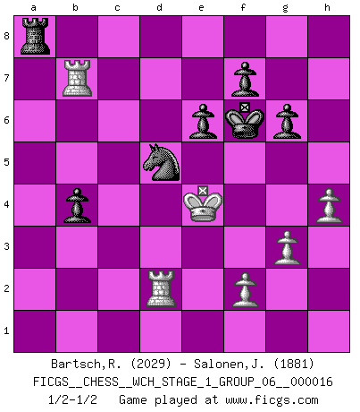 Last move : 1/2-1/2 2016 June 16 11:19:54 [Event "FICGS__CHESS__WCH_STAGE_1_GROUP_06__000016"] [Site "FICGS"] [Date "2016.03.02"] [Round "1"] [White "Bartsch,Reinhard Andrea"] [Black "Salonen,Jukka"] [Result "1/2-1/2"] [WhiteElo "2029"] [BlackElo "1881"] 1.c4 Nf6 2.d4 e6 3.Nf3 d5 4.e3 c6 5.Bd3 Be7 6.Nc3 Nbd7 7.Qc2 dxc4 8.Bxc4 b5 9.Bd3 Bb7 10.e4 b4 11.Na4 h6 12.O-O O-O 13.e5 Nd5 14.Qe2 h5 15.Ng5 g6 16.Ne4 Qa5 17.b3 c5 18.Naxc5 Nxc5 19.dxc5 Bxc5 20.Bh6 Rfd8 21.Qf3 Be7 22.Rfe1 Rd7 23.Rac1 Rad8 24.Qg3 h4 25.Qg4 Nc3 26.Nd6 Bxd6 27.exd6 Qd5 28.Bc4 Qxd6 29.Bg5 Qd4 30.Qxd4 Rxd4 31.Bxd8 Rxd8 32.a3 a5 33.h3 Rd2 34.axb4 axb4 35.Ra1 Bd5 36.Bxd5 Nxd5 37.Re4 Rb2 38.Ra8+ Kg7 39.Ra7 Rb1+ 40.Kh2 Kg8 41.Rxh4 Rxb3 42.Re4 Rb2 43.Kg3 Rd2 44.Rb7 Ra2 45.Re1 Ra3+ 46.Kg4 Ra6 47.h4 Kg7 48.g3 Nf6+ 49.Kf3 Nd5 50.Rc1 Ra3+ 51.Ke2 Ra2+ 52.Kf1 Ra8 53.Rd1 Ra3 54.Ke1 Kf6 55.Rd2 Kg7 56.Ke2 Nc3+ 57.Ke3 Nd5+ 58.Kd4 Rf3 59.Rb2 Kf6 60.Ke4 Ra3 61.Rc2 Ra8 62.Rd2 Nc3+ 63.Kf3 Nd5 64.Ke4 Nc3+ 65.Kd3 Nd5 66.Ke4 1/2-1/2 English, 1...Nf6 (Anglo-Indian defense) Kingside Castling by player White (move 12) Kingside Castling by player Black (move 12) This chess game ended in a draw. Follow this game move after move (download)When I asked Fischer why he had not played a certain move in our game, he replied: 'Well, you laughed when I wrote it down !' (Mikhail Tal) Alles was ich jemals tun will ist Schach spielen. (Robert James Fischer) Bobby es la celebridad menos entendida y malinterpretada que camina el la faz de esta tierra. (Yasser Seirawan) J'ai vu le vaincu d'Echecs jouer des années durant dans l'espoir de la fête de la victoire. Car tu es plus riche de ce qu'elle existe si même elle n'est point pour toi. Ainsi de la perle du fond des mers. (Antoine de Saint-Exupéry) Establishing goals is all right if you don't let them deprive you of interesting detours. (Doug Larson)