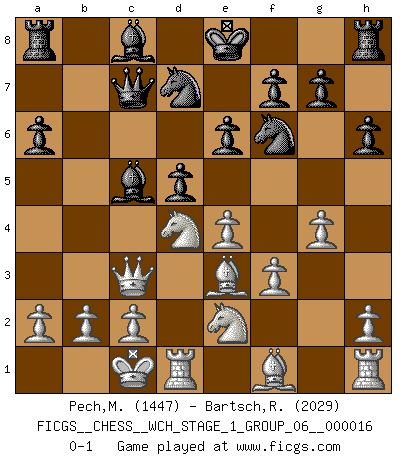 Last move : 0-1 2016 June 18 11:11:10 [Event "FICGS__CHESS__WCH_STAGE_1_GROUP_06__000016"] [Site "FICGS"] [Date "2016.03.02"] [Round "1"] [White "Pech,Matej"] [Black "Bartsch,Reinhard Andrea"] [Result "0-1"] [WhiteElo "1447"] [BlackElo "2029"] 1.e4 c5 2.Nf3 d6 3.d4 cxd4 4.Nxd4 Nf6 5.Nc3 a6 6.Be3 e6 7.f3 b5 8.Qd2 Nbd7 9.g4 b4 10.Nce2 h6 11.O-O-O Qc7 12.Qxb4 d5 13.Qc3 Bc5 0-1 This chess game has been lost on time (started : 2016.03.02 2:9:50) Sicilian : Najdorf, Byrne (English) attack Queenside Castling by player White (move 11) Player Black won this chess game. Follow this game move after move (download)White lost because he failed to remember the right continuation and had to think up the moves himself. (Siegbert Tarrasch) Kein Schachspieler kann gut schlafen. (H. G. Wells) En la vida, como en el Ajedrez, los Peones propios obstruyen nuestro camino. La gran fortuna de un hombre, su comodidad, placer, hijos, libros, que deberían ayudarle a ganar, con mucha frecuencia lo ponen en Jaque Mate. (Charles Buxton) Les échecs sont un jeu terrible. Si vous n'avez pas le centre, votre adversaire a une position plus libre. Par contre, si vous avez le centre, alors vous avez vraiment quelque chose pour laquelle vous inquiéter ! (Siegbert Tarrasch) Warrior pose battles inner weakness and wins focus. You see that there is no war within you. You're on your own side, and you are your own strength. (Terri Guillemets)