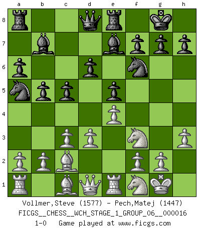 Last move : 1-0 2016 June 12 10:37:35 [Event "FICGS__CHESS__WCH_STAGE_1_GROUP_06__000016"] [Site "FICGS"] [Date "2016.03.02"] [Round "1"] [White "Vollmer,Steve"] [Black "Pech,Matej"] [Result "1-0"] [WhiteElo "1577"] [BlackElo "1447"] 1.e4 e5 2.Nf3 Nc6 3.Bb5 a6 4.Ba4 Nf6 5.O-O Be7 6.Re1 b5 7.Bb3 d6 8.c3 O-O 9.h3 Na5 10.Bc2 c5 11.d3 Bb7 12.Nbd2 Re8 13.Nf1 1-0 This chess game has been lost on time (started : 2016.03.02 2:9:50) Ruy Lopez : Closed Kingside Castling by player White (move 5) Kingside Castling by player Black (move 8) Player White won this chess game. Follow this game move after move (download)Methodical thinking is of more use in Chess than inspiration. (C. J. S. Purdy) Schon mancher Spieler hat aufgegeben, um zu vermeiden, daß er eine Figur verliert. (Savielly Grigorievitsch Tartakower) El jugador táctico sabe que hacer cuando hay algo que hacer; mientras que el estratega sabe que hacer cuando no hay nada que hacer. (Gerald Abrahams) 'L'échange des dames est un coup dur pour les deux adversaires...' Un journaliste lors d'une partie du match Spassky-Fischer To steal ideas from one person is plagiarism. To steal from many is research. (Unknown)