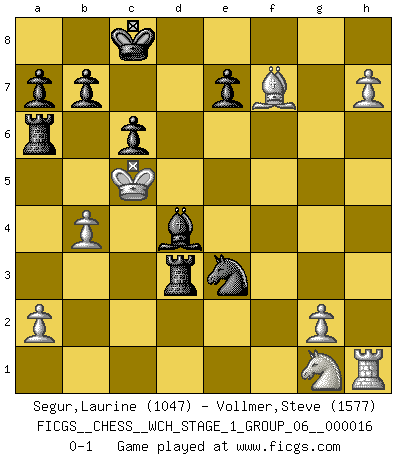 Last move : 0-1 2016 March 17 21:21:53 [Event "FICGS__CHESS__WCH_STAGE_1_GROUP_06__000016"] [Site "FICGS"] [Date "2016.03.02"] [Round "1"] [White "Segur,Laurine"] [Black "Vollmer,Steve"] [Result "0-1"] [WhiteElo "1047"] [BlackElo "1577"] 1.e4 d6 2.d4 Nf6 3.Nc3 g6 4.e5 dxe5 5.dxe5 Qxd1+ 6.Nxd1 Nd5 7.Bc4 Be6 8.Ne3 Nxe3 9.Bxe6 Nxc2+ 10.Kd2 Nxa1 11.Bc4 Nc6 12.b3 O-O-O 13.Kc3 Bg7 14.f4 Nxe5 15.fxe5 Bxe5+ 16.Kb4 Rd1 17.Be3 Nc2+ 18.Ka4 Nxe3 19.Bxf7 Rhd8 20.h4 Bb2 21.h5 R1d4+ 22.b4 Rd3 23.hxg6 R8d6 24.gxh7 Ra6+ 25.Kb5 c6+ 26.Kc5 Bd4+ 0-1 Pirc defense Queenside Castling by player Black (move 12) Player Black won this chess game. Follow this game move after move (download)Examine moves that smite! A good eye for smites is far more important than a knowledge of strategical principles. (Purdy) Ich bin es gewohnt, das die Jugend mir überhaupt keinen Respekt entgegenbringt. (Alexander Morozewich) La estratégia requiere pensar, la táctica requiere observación. (Max Euwe) J'ai toujours senti une vague pitié pour l'homme qui ne connaît rien aux échecs, tout comme j'en aurais pour un homme ignorant de l'amour. Les Echecs, comme la musique ou comme l'amour, ont le pouvoir de rendre heureux. (Siegbert Tarrasch) Life is like a play: it's not the length but the excellence of the acting that matters. (Seneca)