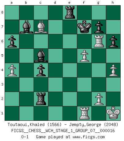 Last move : 0-1 2016 June 15 23:1:44 [Event "FICGS__CHESS__WCH_STAGE_1_GROUP_07__000016"] [Site "FICGS"] [Date "2016.03.02"] [Round "1"] [White "Toutaoui,Khaled"] [Black "Jempty,George"] [Result "0-1"] [WhiteElo "1566"] [BlackElo "2048"] 1.e4 e5 2.Nf3 Nc6 3.d4 exd4 4.Nxd4 Nf6 5.Nc3 Nxe4 6.Nxc6 Nxc3 7.Nxd8 Nxd1 8.Nxf7 Kxf7 9.Bc4+ Kf6 10.h4 b5 11.Bg5+ Ke5 12.Bxb5 Rb8 13.a4 a6 14.f4+ Ke6 15.Bc4+ d5 16.f5+ Ke5 17.Rxd1 dxc4 18.O-O h6 19.Bd2 Kf6 20.Bf4 Rxb2 21.Bxc7 Bc5+ 22.Kh1 Bb7 23.Rde1 Rxc2 24.Re6+ Kf7 25.Rg6 Re8 0-1 This chess game has been lost on time (started : 2016.03.02 2:9:52) Scotch : Schmidt variation Kingside Castling by player White (move 18) Player Black won this chess game. Follow this game move after move (download)Later, I began to succeed in decisive games. Perhaps because I realized a very simple truth: not only was I worried, but also my opponent. (Mikhail Tal) Es liegt in der Natur, vernüftig zu denken und unlogisch zu handeln. (Anatole France) La mitad de las variaciones que son calculadas en una partida de torneo, resultan ser completamente superfluas. Desafortunadamente, nadie sabe por adelantado cual mitad. (Jan Tinman) Si rien de grave n'est détecté lors de l'analyse d'une position, on joue alors le coup. Seconde règle de Blumenfeld. There's always a bigger fish. (Qui-Gon Jinn in Star Wars ep.1)
