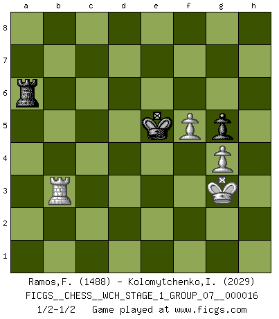 Last move : 1/2-1/2 2016 November 9 14:1:54 [Event "FICGS__CHESS__WCH_STAGE_1_GROUP_07__000016"] [Site "FICGS"] [Date "2016.03.02"] [Round "1"] [White "Ramos,Francis"] [Black "Kolomytchenko,Igor"] [Result "1/2-1/2"] [WhiteElo "1488"] [BlackElo "2029"] 1.e4 e6 2.d4 d5 3.Nc3 Nf6 4.e5 Nfd7 5.f4 c5 6.Nf3 Nc6 7.Be3 Qb6 8.Na4 Qa5+ 9.c3 cxd4 10.b4 Qc7 11.Nxd4 a6 12.a3 Be7 13.Be2 b5 14.Nb2 O-O 15.O-O Nb6 16.a4 Nc4 17.Nxc4 Nxd4 18.Bxd4 bxc4 19.Qe1 Bd7 20.Qg3 Rab8 21.a5 Rb7 22.Rf3 g6 23.Raf1 Qd8 24.Qf2 f6 25.exf6 Bxf6 26.g3 Bxd4 27.Qxd4 Qf6 28.Qd2 Bc6 29.Re3 d4 30.cxd4 Bd5 31.Bg4 Qe7 32.Bxe6+ Bxe6 33.Rfe1 Qxb4 34.Qxb4 Rxb4 35.Rxe6 Rc8 36.Kf2 c3 37.Rc1 Rxd4 38.Rc2 Rd5 39.Rxa6 Kf7 40.Kf3 h5 41.Ke4 Rd7 42.Rb6 Rd2 43.Rxd2 cxd2 44.Rd6 Rc4+ 45.Ke3 Ra4 46.Rxd2 Rxa5 47.h3 Ra1 48.Rd3 Ke6 49.Kf3 Kf6 50.Rc3 Rf1+ 51.Kg2 Rb1 52.g4 hxg4 53.hxg4 Rb6 54.Kg3 g5 55.f5 Ke5 56.Kf3 Ra6 57.Rd3 Ra4 58.Re3+ Kd5 59.Kg3 Ra6 60.Rb3 Ke5 1/2-1/2 French : Steinitz, Boleslavsky variation Kingside Castling by player Black (move 14) Kingside Castling by player White (move 15) 10 pieces endgame at move 46 : White KRPPPP , Black KRPP WHITE : King + 1 Rook 4 Pawns BLACK : King + 1 Rook 2 Pawns 9 pieces endgame at move 46 : White KRPPP , Black KRPP WHITE : King + 1 Rook 3 Pawns BLACK : King + 1 Rook 2 Pawns 8 pieces endgame at move 52 : White KRPP , Black KRPP WHITE : King + 1 Rook 2 Pawns BLACK : King + 1 Rook 2 Pawns 7 pieces endgame at move 53 : White KRPP , Black KRP WHITE : King + 1 Rook 2 Pawns BLACK : King + 1 Rook 1 Pawn This chess game ended in a draw. Follow this game move after move (download)The stomach is an essential part of the Chess master. (Bent Larsen) Im Wettkampf zwischen starken Meistern kommen Fehler sehr selten vor, deshalb ist es mit bloßem Warten nicht getan. (José Raúl Capablanca) En un gambito tu regalas un Peón por el bién de tomar un juego perdido. (Samuel Standige Boden) Demandez au pauvre Cg1 ce qu'il en pense. Eduard Gufeld à propos de la variante Saemisch de l'Est-Indienne. I couldn't make any sense out of what this particular thread is about. It sounds like R2 D2 computer speaking. A space fight ?!? Some 'command' problems in Moscow ? Some killers & narcotic addicts attacking some game & a god wannabe ?? (Dinesh De Silva, lost in a russian conflict in FICGS forum)