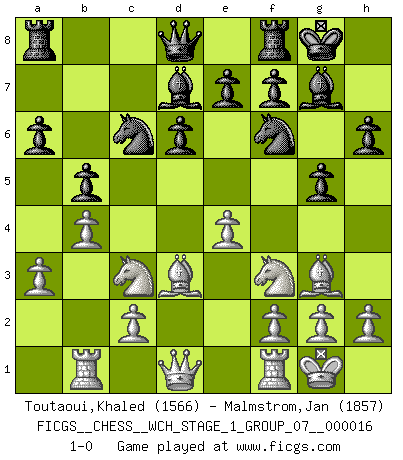 Last move : 1-0 2016 June 11 10:29:32 [Event "FICGS__CHESS__WCH_STAGE_1_GROUP_07__000016"] [Site "FICGS"] [Date "2016.03.02"] [Round "1"] [White "Toutaoui,Khaled"] [Black "Malmstrom,Jan"] [Result "1-0"] [WhiteElo "1566"] [BlackElo "1857"] 1.e4 c5 2.Nf3 d6 3.d4 cxd4 4.Nxd4 Nf6 5.Nc3 a6 6.Bd3 g6 7.Bg5 Bg7 8.Nf3 O-O 9.O-O Nc6 10.Rb1 Bd7 11.a3 h6 12.Bh4 b5 13.b4 g5 14.Bg3 1-0 This chess game has been lost on time (started : 2016.03.02 2:9:52) Sicilian : Najdorf Kingside Castling by player Black (move 8) Kingside Castling by player White (move 9) Player White won this chess game. Follow this game move after move (download)Chess is a foolish expedient for making idle people believe they are doing something very clever when they are only wasting their time. (George Bernard Shaw) Der Vorposten provoziert a) eine Basis für neue Angriffe und b) eine Schwächung der gegnerischen Widerstandskraft in der fraglichen Linie. (Aaron Nimzowitsch) Yo jugué Ajedrez con el y a veces le pude haber ganado solo que siempre devuelve su última jugada y juega la partida de manera diferente. (Mark Twain) Les réformistes prétendent que les progrès de la théorie conduiront à la disparition des échecs, et qu'il faut, pour leur rendre vie, en remanier les règles. En réalité, qu'exprime cette affirmation? Le mépris de l'intuition, de l'imagination et de tous les autres éléments qui font des échecs un art. (Alexander Alekhine) You lose, general Kenobi. (General Grievous in Star Wars ep.3)