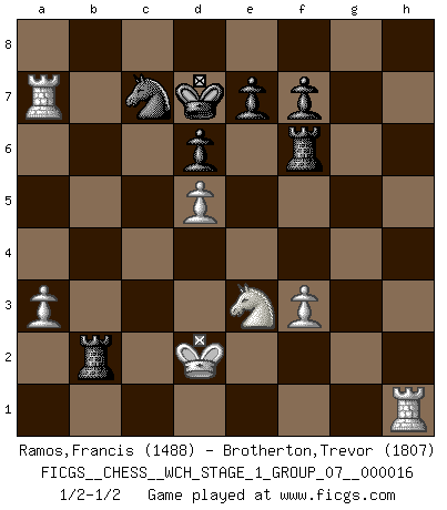 Last move : 1/2-1/2 2016 August 17 9:56:30 [Event "FICGS__CHESS__WCH_STAGE_1_GROUP_07__000016"] [Site "FICGS"] [Date "2016.03.02"] [Round "1"] [White "Ramos,Francis"] [Black "Brotherton,Trevor"] [Result "1/2-1/2"] [WhiteElo "1488"] [BlackElo "1807"] 1.e4 d6 2.d4 Nf6 3.f3 g6 4.Be3 c6 5.Nc3 Nbd7 6.g4 b5 7.Qd2 Nb6 8.Bd3 Nfd7 9.h4 h5 10.gxh5 Rxh5 11.O-O-O Nc4 12.Bxc4 bxc4 13.Nge2 Qa5 14.Nf4 Rh7 15.h5 gxh5 16.d5 cxd5 17.Qxd5 Qxd5 18.Ncxd5 Kd8 19.Nxh5 Bb7 20.Bd4 Rc8 21.a3 Bxd5 22.exd5 Nb6 23.Nf4 Rh6 24.Kd2 Ke8 25.Rdg1 Kd7 26.b3 cxb3 27.cxb3 Na8 28.Bxa7 Rf6 29.Be3 Bh6 30.Rg4 Nc7 31.Ng2 Bxe3+ 32.Nxe3 Rb8 33.Ra4 Rxb3 34.Ra7 Rb2+ 35.Kd3 Rb3+ 36.Kd2 Rb2+ 37.Kd3 Rb3+ 38.Kd2 Rb2+ 1/2-1/2 King's pawn Opening Queenside Castling by player White (move 11) This chess game ended in a draw. Follow this game move after move (download)We don't really know how the game was invented, though there are suspicions. As soon as we discover the culprits, we'll let you know. (Bruce Pandolfini) Es hat in meinem Leben Zeiten gegeben, da ich sehr nahe daran war zu glauben, daß ich auch nicht eine einzige Schachpartie verlieren könnte. (José Raúl Capablanca) Existen dos clases de sacrificios: los correctos y los míos. (Mikhail Tal) Ce qui est bien, c'est d'avoir tout un tas de pièces en prise : l'adversaire ne peut en prendre qu'une à la fois. Cité par Thierry Audin. Computers make it easier to do a lot of things, but most of the things they make it easier to do don't need to be done. (Andy Rooney)