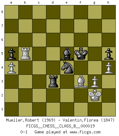 Last move : 0-1 2007 December 9 11:46:18 [Event "FICGS__CHESS__CLASS_B__000019"] [Site "FICGS"] [Date "2007.03.22"] [Round "1"] [White "Mueller,Robert"] [Black "Valentin,Florea"] [Result "0-1"] [WhiteElo "1969"] [BlackElo "1847"] 1.e4 c5 2.Nf3 Nc6 3.d4 cxd4 4.Nxd4 Nf6 5.Nc3 e5 6.Ndb5 d6 7.Bg5 a6 8.Na3 b5 9.Bxf6 gxf6 10.Nd5 f5 11.Bd3 Be6 12.O-O Bxd5 13.exd5 Ne7 14.Nxb5 Bg7 15.Nc3 e4 16.Bc4 Qc7 17.Qe2 O-O 18.Na4 Ng6 19.Bb3 Rfe8 20.c3 Re5 21.Qc4 Qe7 22.Nb6 Rd8 23.Bc2 f4 24.Rae1 Rb8 25.Na4 Re8 26.f3 f5 27.fxe4 fxe4 28.Rf2 f3 29.Nc5 dxc5 30.d6 Qf7 31.Qxf7+ Kxf7 32.d7 Rd8 33.Bxe4 Rxd7 34.Rxf3+ Bf6 35.g3 Kg7 36.Rf2 c4 37.Kg2 Rde7 38.Rfe2 R7e6 39.a3 Nf8 40.Kf1 Rd6 41.Kg2 Nd7 42.Bb1 h5 43.h4 Rb6 44.Ba2 Rxb2 45.Rxb2 Rxe1 46.Bxc4 Nc5 47.Be2 Kg6 48.Bf3 Bxc3 49.Rb8 Re5 50.Rc8 Bd4 51.Ra8 Re6 52.Rg8+ Kh6 53.Rd8 Bf6 54.Rd5 Re5 55.Rd6 Kg7 56.Rc6 a5 57.Rc7+ Kg6 58.Bd1 Be7 59.a4 Bd6 60.Rc6 Rd5 61.Bf3 Rd2+ 62.Kh3 Kf5 63.Rb6 Rd3 64.Kg2 Ne4 65.Rb5+ Be5 0-1 Sicilian : Pelikan (Lasker/Sveshnikov) variation Kingside Castling by player White (move 12) Kingside Castling by player Black (move 17) Player Black won this chess game. Follow this game move after move (download)Checkers is for tramps. (Paul Morphy) Man wirke der falschen Auffassung entgegen, als ob jeder Zug Unmittelbares zu leisten habe; auch Werte- und Ruhezüge haben ihre Existenzberechtigung. (Aaron Nimzowitsch) La vida es como un juego de Ajedrez, cambiando con cada movimiento. (Proverbio Chino) Un footballeur joue avec ses pieds, parfois avec sa tête. Un joueur d'échecs ne joue qu'avec sa tête. Et quand il ne joue plus, il meurt. (Jacob Murray) A person who never made a mistake never tried anything new. (Albert Einstein)