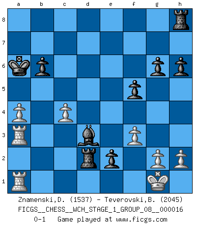 Last move : 0-1 2016 March 16 9:20:40 [Event "FICGS__CHESS__WCH_STAGE_1_GROUP_08__000016"] [Site "FICGS"] [Date "2016.03.02"] [Round "1"] [White "Znamenski,Dimitri"] [Black "Teverovski,Bogoljub"] [Result "0-1"] [WhiteElo "1537"] [BlackElo "2045"] 1.e4 c5 2.Nf3 a6 3.d4 cxd4 4.Nxd4 Nf6 5.Qf3 e5 6.Nf5 d5 7.exd5 Qxd5 8.Qxd5 Nxd5 9.Bc4 Be6 10.Bxd5 Bxd5 11.O-O Be6 12.Ng3 Nc6 13.c3 O-O-O 14.Nd2 Be7 15.Nde4 b6 16.b3 h6 17.a4 f5 18.Nd2 Kb7 19.Re1 Rd7 20.b4 e4 21.b5 Ne5 22.bxa6+ Kxa6 23.Ba3 Bxa3 24.Rxa3 Rxd2 25.Nh5 g6 26.Nf4 Bc4 27.f3 Nd3 28.Nxd3 Bxd3 29.Rea1 e3 30.c4 e2 0-1 Sicilian : O'Kelly variation Kingside Castling by player White (move 11) Queenside Castling by player Black (move 13) Player Black won this chess game. Follow this game move after move (download)I guess a certain amount of temperament is expected of Chess geniuses. (Ron Gross) Das Schachspiel übertrifft alle anderen Spiele so weit wie der Chimborasso einen Misthaufen. (Arthur Schopenhauer) En el Ajedrez, tal como es jugado por los Maestros, practicamente la suerte es eliminada. (Emanuel Lasker) Je menace de comprendre la position. (Anonyme) In every real man a child is hidden that wants to play. (Friedrich Nietzsche)