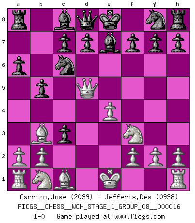Last move : 1-0 2016 March 22 16:6:1 [Event "FICGS__CHESS__WCH_STAGE_1_GROUP_08__000016"] [Site "FICGS"] [Date "2016.03.02"] [Round "1"] [White "Carrizo,Jose"] [Black "Jefferis,Des"] [Result "1-0"] [WhiteElo "2039"] [BlackElo "0938"] 1.e4 e5 2.Nf3 Nc6 3.Bb5 a6 4.Ba4 b5 5.Bb3 Be7 6.d4 exd4 7.c3 dxc3 8.Qd5 1-0 Ruy Lopez : Caro variation Player White won this chess game. Follow this game move after move (download)Fischer wanted to give the Russians a taste of their own medicine. (Larry Evans) Konzentriere dich auf materielle Gewinne. Nimm, was dir dein Gegner gibt, ausser es gibt einen guten Grund der dagegenspricht. (Robert James Fischer) Yo adoro todas la posiciones. Denme una partida posicional difícil, y la jugaré. Pero posiciones totalmente ganadas, no las tolero. (Hein Donner) Pour se monter efficace, un Cavalier a besoin d'avant-postes ! Les Cavaliers font les meilleurs bloqueurs de pions passés. When a man with money meets a man with experience, the man with experience leaves with money and the man with money leaves with experience. (Anonymous)