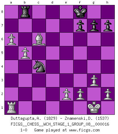 Last move : 1-0 2016 March 17 8:23:25 [Event "FICGS__CHESS__WCH_STAGE_1_GROUP_08__000016"] [Site "FICGS"] [Date "2016.03.02"] [Round "1"] [White "Duttagupta,Aniruddha"] [Black "Znamenski,Dimitri"] [Result "1-0"] [WhiteElo "1829"] [BlackElo "1537"] 1.c4 e5 2.g3 Nf6 3.Bg2 c6 4.d4 Bb4+ 5.Bd2 Bxd2+ 6.Qxd2 exd4 7.Qxd4 O-O 8.Nc3 d6 9.Nf3 Nbd7 10.Qxd6 Re8 11.O-O Ne4 12.Nxe4 Rxe4 13.Nd4 Re8 14.b4 Nb6 15.Qxd8 Rxd8 16.Rfd1 Nxc4 17.Nxc6 Rxd1+ 18.Rxd1 Be6 19.Ne7+ Kf8 20.Bxb7 Rb8 21.Nc6 Re8 22.Nxa7 Rb8 23.Nc6 Re8 24.a4 Nb2 25.Ra1 Bd5 26.a5 Bxc6 27.Bxc6 Rb8 28.b5 Nc4 29.a6 1-0 English Opening Kingside Castling by player Black (move 7) Kingside Castling by player White (move 11) Player White won this chess game. Follow this game move after move (download)You have to have the fighting spirit. You have to force moves and take chances. (Bobby Fischer) Ein Isolani verdüstert die Stimmung auf dem ganzen Schachbrett. (Savielly Grigorievitsch Tartakower) No soy una persona materialista y por eso, no resiento la falta o pérdida del dinero. La ausencia de cosas mundanas carece de importancia. Ya que el Ajedrez es una forma en la que puedo ser tan materialista como yo desee sin tener la necesidad de vender mi alma. (Jamie Walter Adams) Dans le domaine de la peinture, de la gravure et de la sculpture, dès la première décennie de notre siècle, les artistes abandonnent la représentation de la partie d'échecs pour se concentrer sur les pièces, sur les échiquiers et sur toutes les variations auxquelles les unes et les autres peuvent donner lieu. On passe en quelque sorte d'un thème social à un thème musical (au sens de la musica médiévale, c'est-à-dire d'une notion qui inclue le rythme, l'harmonie, la construction et la déconstruction, etc.). Graphiquement et picturalement, l'échiquier apparaît comme une structure ouverte, dynamique, d'une richesse infinie, autorisant toutes les combinatoires et débouchant sur des mouvements et des rythmes de nature exponentielle. (Michel Pastoureau) The real danger is not that computers will begin to think like men, but that men will begin to think like computers. (Sydney J. Harris)
