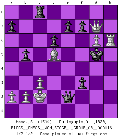 Last move : 1/2-1/2 2016 June 24 18:52:27 [Event "FICGS__CHESS__WCH_STAGE_1_GROUP_08__000016"] [Site "FICGS"] [Date "2016.03.02"] [Round "1"] [White "Haack,Stefan"] [Black "Duttagupta,Aniruddha"] [Result "1/2-1/2"] [WhiteElo "1504"] [BlackElo "1829"] 1.e4 c5 2.Nf3 d6 3.d4 cxd4 4.Nxd4 Nf6 5.Nc3 g6 6.Be3 Bg7 7.f3 O-O 8.Qd2 Nc6 9.Bc4 Bd7 10.O-O-O Rc8 11.Bb3 Ne5 12.h4 h5 13.Bg5 Rc5 14.Kb1 b5 15.g4 hxg4 16.h5 Nxh5 17.Nd5 Re8 18.Rxh5 gxh5 19.Qh2 Rxd5 20.Bxd5 Qb6 21.Nf5 Bxf5 22.exf5 Qc5 23.Qxh5 Rc8 24.c3 gxf3 25.Bh6 Qf2 26.Bxg7 Kxg7 27.Rh1 Qe3 28.Qh7+ Kf6 29.Rh6+ Kg5 30.Qg7+ Ng6 31.fxg6 Qe1+ 32.Kc2 Qe2+ 33.Kc1 Qe1+ 34.Kc2 Qe2+ 35.Kc1 Qe1+ 36.Kc2 Qe2+ 1/2-1/2 Sicilian : Dragon, Yugoslav attack, 7...O-O Kingside Castling by player Black (move 7) Queenside Castling by player White (move 10) This chess game ended in a draw. Follow this game move after move (download)An attack on the wing should be met by play in the center. (Nimzovitch) Vielleicht wirkt die Aura früherer Spieler glanzvoller als die der heutigen Spieler, aber das liegt daran, dass man kein Programm wie Fritz hatte, das einem all die Löcher in ihren Partien zeigt. (Vladimir Kramnik) Bobby es el jugador de Ajedrez mas fino que este país jamás haya producido. Su memoria para las movidas, su brillantez en soñar combinaciones y su feróz determinación por la victoria son algo extraño. (John Collins) 'L'échange des dames est un coup dur pour les deux adversaires...' Un journaliste lors d'une partie du match Spassky-Fischer It's only after you lost everything, Tyler says, that you're free to do anything. (Chuck Palahniuk, Fight Club)