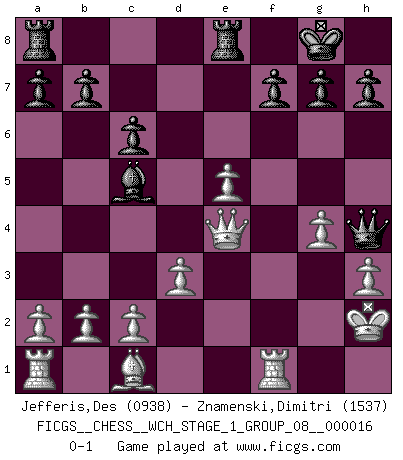 Last move : 0-1 2016 April 20 10:3:14 [Event "FICGS__CHESS__WCH_STAGE_1_GROUP_08__000016"] [Site "FICGS"] [Date "2016.03.02"] [Round "1"] [White "Jefferis,Des"] [Black "Znamenski,Dimitri"] [Result "0-1"] [WhiteElo "0938"] [BlackElo "1537"] 1.e4 c6 2.d3 e5 3.Nd2 Nf6 4.Ngf3 Be7 5.g3 d6 6.Bg2 O-O 7.O-O Bg4 8.h3 Bxf3 9.Bxf3 d5 10.g4 dxe4 11.Nxe4 Nxe4 12.Bxe4 Bc5 13.Qe2 Qh4 14.Kh2 Nd7 15.f4 Nf6 16.fxe5 Nxe4 17.Qxe4 Rfe8 0-1 This chess game has been lost on time (started : 2016.03.02 2:9:53) Caro-Kann : Closed (Breyer) variation Kingside Castling by player Black (move 6) Kingside Castling by player White (move 7) Player Black won this chess game. Follow this game move after move (download)In Chess, at least, the brave inherit the earth. (Edmar Mednis) Je älter ich werde, um so mehr schätze ich die Bauern. (Paul Keres) Una de estas pequeñas movidas modestas pudieran ser mas molestas a tu oponente que la amenaza mas grande. (Siegbert Tarrasch) Les Echecs, c'est l'art de la guerre sans les charniers, c'est la résurrection des morts tombés au champ d'honneur, l'espoir perpétuel, la suprématie de l'intelligence sur la force, la culture de l'esprit. (F. Szpiner) You can only get smarter by playing a smarter opponent. (Revolver, movie)