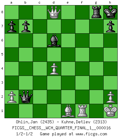 Last move : 1/2-1/2 2016 July 6 15:54:13 [Event "FICGS__CHESS__WCH_QUARTER_FINAL_1__000016"] [Site "FICGS"] [Date "2016.03.02"] [Round "5"] [White "Ohlin,Jan"] [Black "Kuhne,Detlev"] [Result "1/2-1/2"] [WhiteElo "2435"] [BlackElo "2313"] 1.d4 Nf6 2.Nf3 d5 3.c4 c6 4.Nbd2 Bf5 5.Nh4 Be6 6.e3 g5 7.Nhf3 g4 8.cxd5 cxd5 9.Ne5 Nbd7 10.Nb3 Rc8 11.Bd2 Bg7 12.Nxd7 Bxd7 13.Nc5 Ne4 14.Nxd7 Qxd7 15.Bb4 O-O 16.Bd3 Kh8 17.O-O f5 18.Qe2 Rg8 19.Rac1 e6 20.Kh1 Bf8 21.Rxc8 Qxc8 22.Be1 Nf6 23.f3 Bd6 24.e4 gxf3 25.gxf3 dxe4 26.fxe4 Nxe4 27.Bxe4 fxe4 28.Qxe4 Qc1 29.Qxe6 Qxb2 30.Qf6+ Rg7 31.Qd8+ Rg8 1/2-1/2 Queen's pawn game Kingside Castling by player Black (move 15) Kingside Castling by player White (move 17) This chess game ended in a draw. Follow this game move after move (download)Before the endgame, the Gods have placed the middle game. (Siegbert Tarrasch) Ich verstehe mehr vom Schach als irgendein anderer lebender Meister. (José Raúl Capablanca) Mis oponentes también hacen buenas movidas. A veces yo no tomo esas cosas en consideración. (Bobby Fischer) Vous n'êtes pas toujours obligé de jouer le meilleur coup. Un coup doit être actif, entreprenant, correct et beau ! (David Bronstein) Life is pain my dear and anyone who says otherwise is selling something. (Princess Bride)