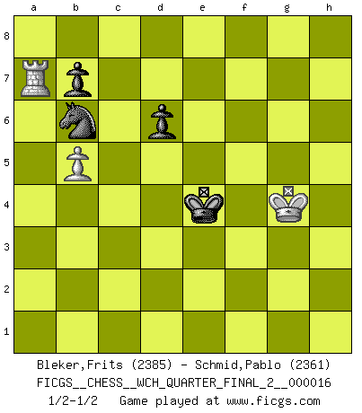 Last move : 1/2-1/2 2016 September 4 11:15:15 [Event "FICGS__CHESS__WCH_QUARTER_FINAL_2__000016"] [Site "FICGS"] [Date "2016.03.02"] [Round "5"] [White "Bleker,Frits"] [Black "Schmid,Pablo"] [Result "1/2-1/2"] [WhiteElo "2385"] [BlackElo "2361"] 1.Nf3 Nf6 2.c4 g6 3.Nc3 Bg7 4.e4 d6 5.d4 O-O 6.Be2 e5 7.O-O Nc6 8.d5 Ne7 9.Ne1 Nd7 10.f3 f5 11.g4 Kh8 12.Nd3 Ng8 13.Kh1 f4 14.Bd2 Nh6 15.b4 Nf7 16.c5 Nf6 17.Rc1 h5 18.gxh5 Nxh5 19.Rg1 Kh7 20.cxd6 cxd6 21.Nb5 Bd7 22.Nc7 Rc8 23.Ne6 Bxe6 24.dxe6 Rxc1 25.Nxc1 Ng5 26.Qf1 Bf6 27.Bc4 Kg7 28.Ne2 Qc8 29.Bb3 Nxe6 30.Qg2 Ng5 31.h4 Rh8 32.Rc1 Qd8 33.Qg4 Nf7 34.Qe6 Rf8 35.Rg1 Qe8 36.Be1 Qxe6 37.Bxe6 Re8 38.Bd5 Rh8 39.Kg2 Rc8 40.Kh3 Bd8 41.Rg2 Rc7 42.Be6 Nf6 43.Nc3 Rc6 44.Bd2 Bb6 45.Bf5 Nh8 46.Be6 Bd4 47.Nb5 Be3 48.Bd5 Nxd5 49.exd5 Rb6 50.Nxa7 Bxd2 51.b5 Ba5 52.a4 Nf7 53.Nc8 e4 54.fxe4 f3 55.Rg3 Ne5 56.h5 Kf6 57.hxg6 Nxg6 58.Rxf3+ Ke5 59.Ra3 Kxe4 60.Nxb6 Bxb6 61.a5 Nf4+ 62.Kg4 Nxd5 63.axb6 Nxb6 64.Ra7 1/2-1/2 Comment by player 2 : Pablo Schmid : Indeed that anti-Moscow went wrong after a stupid blunder (move played by head where I forgot to play an intermediate move at move 15 if I remember well). Then I was very afraid of losing but by chance my position was still quite holdable but I suspect you could give me more headhache. I did not see a clear win but maybe something more dangerous between move 21 to 24. Then it seems I got a "forced" simplification. Reti Opening Kingside Castling by player Black (move 5) Kingside Castling by player White (move 7) 10 pieces endgame at move 60 : White KRPPP , Black KBNPP WHITE : King + 1 Rook 3 Pawns BLACK : King + 1 Bishop 1 Knight 2 Pawns 9 pieces endgame at move 62 : White KRPP , Black KBNPP WHITE : King + 1 Rook 2 Pawns BLACK : King + 1 Bishop 1 Knight 2 Pawns 8 pieces endgame at move 63 : White KRPP , Black KNPP WHITE : King + 1 Rook 2 Pawns BLACK : King + 1 Knight 2 Pawns 7 pieces endgame at move 63 : White KRP , Black KNPP WHITE : King + 1 Rook 1 Pawn BLACK : King + 1 Knight 2 Pawns This chess game ended in a draw. Follow this game move after move (download)In Chess, just as in life, today's bliss may be tomorrow's poison. (Assaic) Mit sehr nachdenklichem Gesicht schreitet Bobby durch den Turniersaal. Was ist passiert?, fragt Lombardy. Ich stehe schlecht, antwortet Fischer. Lombardy: Dann biete doch einfach Remis an. Fischer: So schlecht stehe ich nun auch wieder nicht! (Robert James Fischer) No volvere nunca a jugar contigo. Has insultado a mi amigo. - cuando un oponente se maldijo por una mala jugada (Miguel Najdorf) Lorsque vous vous retrouvez devant une position atroce, ne tendez pas un ultime piège dérisoire avec l'intention d'abandonner si l'adversaire le déjoue ! Faites-vous plutôt un devoir de résister comme si votre vie en dépendait. Jouez le coup qui vous déplairait au centuple si vous étiez dans la peau de votre tortionnaire ! I've never seen so many men wasted so badly. (Blondie in The Good, The Bad and The Ugly)