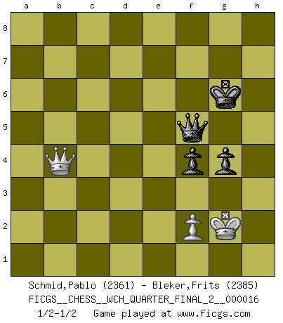 Last move : 1/2-1/2 2016 August 5 10:27:27 [Event "FICGS__CHESS__WCH_QUARTER_FINAL_2__000016"] [Site "FICGS"] [Date "2016.03.02"] [Round "8"] [White "Schmid,Pablo"] [Black "Bleker,Frits"] [Result "1/2-1/2"] [WhiteElo "2361"] [BlackElo "2385"] 1.d4 d5 2.c4 c6 3.Nf3 Nf6 4.Nc3 e6 5.Bg5 h6 6.Bh4 dxc4 7.e4 g5 8.Bg3 b5 9.Ne5 Nbd7 10.Be2 Bb7 11.Qc2 Bg7 12.Rd1 Qe7 13.O-O O-O 14.h4 Rad8 15.Nxd7 Nxd7 16.hxg5 hxg5 17.e5 c5 18.Nxb5 cxd4 19.Rxd4 Nxe5 20.Rxd8 Rxd8 21.Rd1 Bd5 22.Qc1 f5 23.Bxe5 Bxe5 24.Nc3 Bf6 25.g4 Kg7 26.gxf5 exf5 27.Rxd5 Rxd5 28.Nxd5 Qxe2 29.Nxf6 Kxf6 30.Qc3+ Kg6 31.Qh8 Qe6 32.Qb8 a6 33.Qd8 f4 34.Kh2 Qc6 35.Qf8 Qd5 36.Qc8 a5 37.b3 cxb3 38.axb3 Kf7 39.Qa6 Qc5 40.Kg2 Ke7 41.Kf3 Qf5 42.Qb7+ Kf6 43.Qa6+ Kg7 44.Qc6 g4+ 45.Kg2 Kh7 46.b4 axb4 47.Qb7+ Kg6 48.Qxb4 1/2-1/2 QGD Slav : 4.Nc3 Kingside Castling by player White (move 13) Kingside Castling by player Black (move 13) 10 pieces endgame at move 37 : White KQPP , Black KQPPPP WHITE : King + 1 Queen 2 Pawns BLACK : King + 1 Queen 4 Pawns 9 pieces endgame at move 38 : White KQPP , Black KQPPP WHITE : King + 1 Queen 2 Pawns BLACK : King + 1 Queen 3 Pawns 8 pieces endgame at move 46 : White KQP , Black KQPPP WHITE : King + 1 Queen 1 Pawn BLACK : King + 1 Queen 3 Pawns 7 pieces endgame at move 48 : White KQP , Black KQPP WHITE : King + 1 Queen 1 Pawn BLACK : King + 1 Queen 2 Pawns This chess game ended in a draw. Follow this game move after move (download)When in doubt... play Chess ! (Tevis) Die westlichen Werte sind eine Sprache, welche die Putin-Administration nicht versteht. (Garry Kasparov) En el Ajedrez, tal como en la vida, las bendiciones de hoy pueden ser el veneno del mañana. (Assaic) Les échecs sont plus proches de l'art de l'assassinat que de l'art de la guerre. (Arturo Perez-Reverte) It's not the size of the dog in the fight, it's the size of the fight in the dog. (Mark Twain)