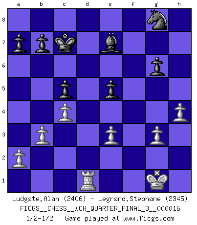 Last move : 1/2-1/2 2016 June 9 8:36:59 [Event "FICGS__CHESS__WCH_QUARTER_FINAL_3__000016"] [Site "FICGS"] [Date "2016.03.02"] [Round "1"] [White "Ludgate,Alan"] [Black "Legrand,Stephane"] [Result "1/2-1/2"] [WhiteElo "2406"] [BlackElo "2345"] 1.c4 g6 2.Nc3 Bg7 3.g3 c5 4.Bg2 Nc6 5.Nf3 d6 6.O-O Bf5 7.b3 Qd7 8.Bb2 Bh3 9.e3 h5 10.d4 Bxg2 11.Kxg2 h4 12.dxc5 hxg3 13.fxg3 Qh3+ 14.Kg1 dxc5 15.Qe2 O-O-O 16.Ng5 Qh5 17.Nxf7 Qxe2 18.Nxe2 Bxb2 19.Rab1 Be5 20.Nxh8 Bxh8 21.Nf4 Rd6 22.Rbd1 Ne5 23.Rxd6 exd6 24.Nd3 Bf6 25.Nxe5 dxe5 26.Rd1 Kc7 27.h4 Be7 1/2-1/2 English Opening Kingside Castling by player White (move 6) Queenside Castling by player Black (move 15) This chess game ended in a draw. Follow this game move after move (download)Examine moves that smite! A good eye for smites is far more important than a knowledge of strategical principles. (Purdy) Es tut gut, die Entwicklungsperiode von, [...] demokratischem Geist durchdringen zu lassen. Wie undemokratisch wäre es doch beispielsweise, den einen Offizier große Spaziertouren vornehmen zu lassen, während die anderen zu Hause säßen und sich entsetzlich langweilten. (Aaron Nimzowitsch) El Ajedrez moderno está demasiado preocupado con cosas como la estructura de Peones. Olvidenlo, el Jaque Mate termina la partida. (Nigel Short) On entre au jeu d'Echecs comme on entre en Religion. Pour le joueur d'Echecs, la partie d'Echecs c'est l'office, la messe, le défilé du 1er Mai, le dépôt de gerbe au Monument aux Morts. C'est un drame sacré. (Michel Roos) Memory is a complicated thing, a relative to truth, but not its twin. (Barbara Kingsolver, Animal Dreams)