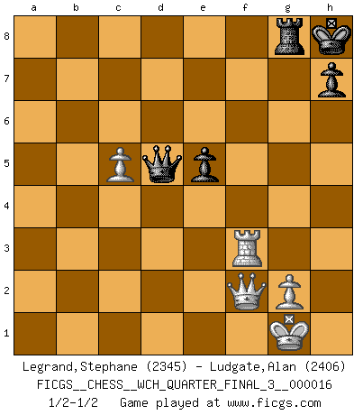 Last move : 1/2-1/2 2016 August 3 0:39:46 [Event "FICGS__CHESS__WCH_QUARTER_FINAL_3__000016"] [Site "FICGS"] [Date "2016.03.02"] [Round "4"] [White "Legrand,Stephane"] [Black "Ludgate,Alan"] [Result "1/2-1/2"] [WhiteElo "2345"] [BlackElo "2406"] 1.d4 g6 2.e4 d6 3.Nc3 Bg7 4.Be3 c6 5.Qd2 b5 6.Nf3 Nd7 7.Bd3 Qc7 8.Ne2 Bb7 9.c3 c5 10.Ng3 a6 11.O-O Ngf6 12.Bh6 O-O 13.Bxg7 Kxg7 14.Rfe1 e5 15.a4 bxa4 16.Rxa4 a5 17.dxe5 dxe5 18.Qg5 Ng8 19.Nf5+ Kh8 20.Ne3 f6 21.Qg3 Ne7 22.h4 c4 23.Bc2 Nc5 24.Rxc4 Ba6 25.Rd4 Qb8 26.R4d1 a4 27.Bb1 Bc8 28.Nd5 Nxd5 29.exd5 Bf5 30.h5 Bxb1 31.Rxb1 gxh5 32.Nd2 Qb7 33.Qf3 Rab8 34.c4 Qg7 35.Ne4 Nb3 36.Qxh5 Rg8 37.Ng3 Nd2 38.Rbc1 Rxb2 39.c5 Nb3 40.Rc3 a3 41.Qd1 Nd4 42.Rxa3 f5 43.Qa1 Rxf2 44.Kxf2 f4 45.Kg1 f3 46.R1e3 Qxg3 47.Qf1 Qf4 48.Rxf3 Nxf3+ 49.Rxf3 Qd4+ 50.Qf2 Qxd5 1/2-1/2 Modern defense Kingside Castling by player White (move 11) Kingside Castling by player Black (move 12) 10 pieces endgame at move 50 : White KQRPP , Black KQRPP WHITE : King + 1 Queen 1 Rook 2 Pawns BLACK : King + 1 Queen 1 Rook 2 Pawns This chess game ended in a draw. Follow this game move after move (download)You may learn much more from a game you lose than from a game you win. You will have to lose hundreds of games before becoming a good player. (Jose Raul Capablanca) Ich verachte die Medien. (Robert James Fischer) Mis oponentes también hacen buenas movidas. A veces yo no tomo esas cosas en consideración. (Bobby Fischer) Le succès, c'est être capable d'aller d'échec en échec sans perdre son enthousiasme. (Winston Churchill) All art requires courage. (Anne Tucker)