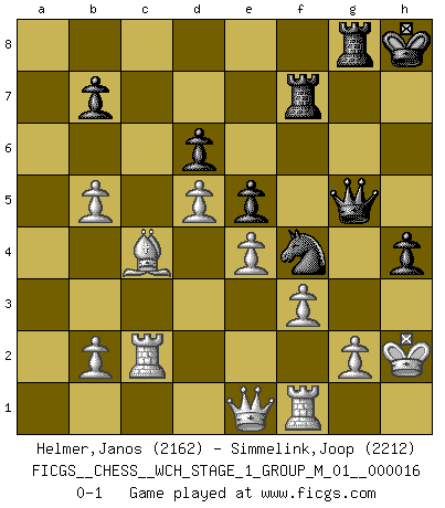 Last move : 0-1 2016 July 6 23:8:32 [Event "FICGS__CHESS__WCH_STAGE_1_GROUP_M_01__000016"] [Site "FICGS"] [Date "2016.03.02"] [Round "1"] [White "Helmer,Janos"] [Black "Simmelink,Joop"] [Result "0-1"] [WhiteElo "2162"] [BlackElo "2212"] 1.Nf3 Nf6 2.c4 d6 3.d4 g6 4.Nc3 Bg7 5.e4 O-O 6.Be2 e5 7.O-O Nc6 8.d5 Ne7 9.Ne1 Nd7 10.Be3 f5 11.f3 f4 12.Bf2 g5 13.Nd3 Nf6 14.c5 Ng6 15.Rc1 Rf7 16.Kh1 Bf8 17.cxd6 cxd6 18.a4 h5 19.Nb5 g4 20.Nxa7 Bd7 21.Nb5 g3 22.hxg3 fxg3 23.Bxg3 h4 24.Be1 Nh5 25.Kh2 Bxb5 26.axb5 Bh6 27.Bd2 Bf4+ 28.Nxf4 Ngxf4 29.Bxf4 Nxf4 30.Rc2 Qg5 31.Bc4 Kh8 32.Qe1 Rg8 0-1 Joop Simmelink thanks for the game! Reti Opening Kingside Castling by player Black (move 5) Kingside Castling by player White (move 7) Player Black won this chess game. Follow this game move after move (download)When your house is on fire, you can't be bothered with the neighbors. Or, as we say in Chess, if your King is under attack you don't worry about losing a Pawn on the Queen's side. (Gary Kasparov) Kritik überlasse ich den Spießern. Ich zeige nichts, wofür ich mich schämen muss. (Alexandra Kosteniuk) Alguna parte de un error es siempre correcto. (Savielly Tartakover) Je crois qu'il existe des manières très spécifiques de jouer efficacement contre une machine. Evidemment, nous n'avons aucune chance en technique pure, parce que l'ordinateur calcule de manière parfaite. Mais lorsque nous faisons appel à notre cerveau, en utilisant l'intuition et la compréhension, alors nous restons beaucoup plus forts. (Anatoli Karpov) 'preceded by its own quotation yields a falsehood' preceded by its own quotation yields a falsehood. (W. V. O. Quine - Set Theory And Its Logic, 1953)