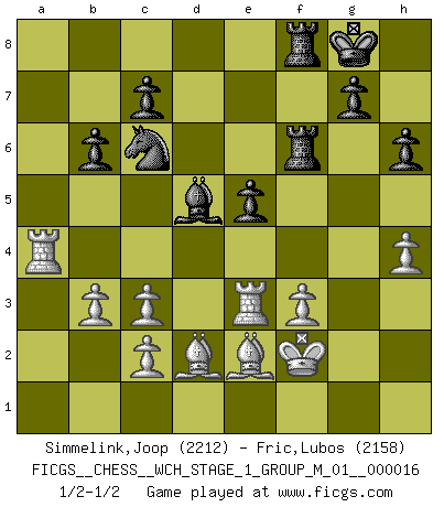 Last move : 1/2-1/2 2016 April 4 14:58:21 [Event "FICGS__CHESS__WCH_STAGE_1_GROUP_M_01__000016"] [Site "FICGS"] [Date "2016.03.02"] [Round "1"] [White "Simmelink,Joop"] [Black "Fric,Lubos"] [Result "1/2-1/2"] [WhiteElo "2212"] [BlackElo "2158"] 1.f4 b6 2.e4 Bb7 3.Nc3 e6 4.Nf3 Bb4 5.e5 Ne7 6.a3 Bxc3 7.dxc3 Nf5 8.Bd3 Nh4 9.Qe2 Nxf3+ 10.gxf3 Qh4+ 11.Qf2 Qxf2+ 12.Kxf2 Nc6 13.h4 O-O 14.Bd2 f6 15.exf6 Rxf6 16.Rag1 Raf8 17.Rg5 d6 18.a4 Ne7 19.a5 h6 20.Rg4 e5 21.Ra1 Bd5 22.axb6 axb6 23.Ra7 Rc8 24.b3 Be6 25.fxe5 dxe5 26.Re4 Nc6 27.R7a4 Bd5 28.Re3 Rcf8 29.Be2 1/2-1/2 Bird's Opening Kingside Castling by player Black (move 13) This chess game ended in a draw. Follow this game move after move (download)You sit at the board and suddenly your heart leaps. Your hand trembles to pick up the piece and move it. But what Chess teaches you is that you must sit there calmly and think about whether it's really a good idea and whether there are other better ideas. (Stanley Kubrick) Jede Eröffnung ist gut genug um gespielt zu werden, wenn nur ihr Ruf schlecht genug ist. (Savielly Grigorievitsch Tartakower) Del Ajedrez se ha dicho que la vida no es lo suficientemente larga para él, pero eso es culpa de la vida, no del Ajedrez. (William Ewart Napier) Ce n'est pas pour s'amuser qu'il joue aux échecs : il célèbre un culte. (Vladimir Nabokov) Wisdom doesn't necessarily come with age. Sometimes age just shows up all by itself. (Tom Watson)