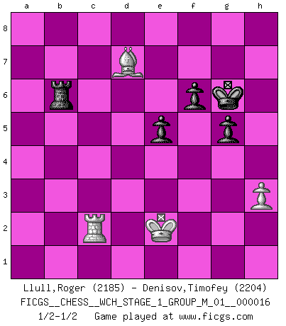 Last move : 1/2-1/2 2016 October 23 10:18:19 [Event "FICGS__CHESS__WCH_STAGE_1_GROUP_M_01__000016"] [Site "FICGS"] [Date "2016.03.02"] [Round "1"] [White "Llull,Roger"] [Black "Denisov,Timofey"] [Result "1/2-1/2"] [WhiteElo "2185"] [BlackElo "2204"] 1.e4 c5 2.Nf3 d6 3.d4 cxd4 4.Nxd4 Nf6 5.Nc3 a6 6.Be3 e6 7.Be2 Nbd7 8.g4 h6 9.f4 g5 10.f5 Ne5 11.h3 b5 12.a3 Be7 13.Qd2 Qa5 14.O-O Qd8 15.Rf2 Bd7 16.Rg2 Qc8 17.Rf1 Qb7 18.Rgf2 Nxe4 19.Nxe4 Qxe4 20.Re1 Qb7 21.Bf1 Qc7 22.c3 Rb8 23.Qc2 Qc8 24.fxe6 Bxe6 25.Nf5 Bxf5 26.Rxf5 Qe6 27.Ba7 Rc8 28.Qf2 f6 29.a4 bxa4 30.Bxa6 Rd8 31.Bb5+ Kf7 32.Bd4 Kg7 33.Bxa4 h5 34.Bd1 hxg4 35.Bxg4 Qb3 36.Qg3 Rh4 37.Rf2 Rf8 38.Re4 Bd8 39.Qe3 R4h8 40.Bf5 Re8 41.Rd2 Rh6 42.Re2 Bc7 43.Kg2 Qb7 44.b4 R6h8 45.Rf2 Ra8 46.Bxe5 dxe5 47.Qf3 Bb6 48.Rd2 Rad8 49.Rc2 Kf7 50.Rc4 Qxf3+ 51.Kxf3 Rd6 52.Ke2 Ra8 53.Rc8 Rxc8 54.Bxc8 Kg6 55.c4 Rd4 56.c5 Rxb4 57.cxb6 Rxb6 58.Bd7 1/2-1/2 Sicilian : Najdorf, Byrne (English) attack Kingside Castling by player White (move 14) 10 pieces endgame at move 57 : White KRBPP , Black KRPPP WHITE : King + 1 Rook 1 Bishop 2 Pawns BLACK : King + 1 Rook 3 Pawns 9 pieces endgame at move 57 : White KRBP , Black KRPPP WHITE : King + 1 Rook 1 Bishop 1 Pawn BLACK : King + 1 Rook 3 Pawns This chess game ended in a draw. Follow this game move after move (download)Castle early and often. (Rob Sillars) Garry Kasparov war erst in der Großmeister-Organisation GMA, dann in der Profischach-Vereinigung PCA, zum Schluss kehrte er wieder in den Schoß der FIDE zurück. Aber gut, manche Leute sind flexibel (Viswanathan Anand) Muchos jugadores de Ajedrez se sorprendían cuando después de la partida, Fischer explicaba con calma: 'Yo ya había analizado esta posibilidad' en una posición en la cual yo creía que no era posible de prever desde la apertura. (Mikhail Tal) Les Echecs sont affaire de jugement sensible. Savoir quand frapper et quand esquiver. (Fischer) Without enthusiasm, virtue functions not at all, and vice only poorly. (Mignon McLaughlin, The Neurotic's Notebook, 1960)