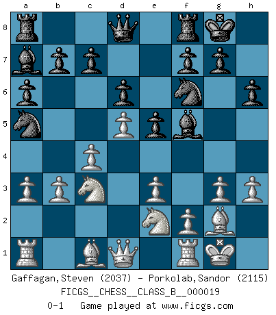 Last move : 0-1 2007 July 16 23:14:17 [Event "FICGS__CHESS__CLASS_B__000019"] [Site "FICGS"] [Date "2007.03.22"] [Round "1"] [White "Gaffagan,Steven"] [Black "Porkolab,Sandor"] [Result "0-1"] [WhiteElo "2037"] [BlackElo "2115"] 1.c4 e5 2.Nc3 Nf6 3.g3 Nc6 4.Bg2 Bc5 5.e3 O-O 6.Nge2 d6 7.a3 a6 8.O-O Bg4 9.h3 Bf5 10.d4 Ba7 11.d5 Na5 12.b3 h6 0-1 This chess game has been lost on time (started : 2007.03.22 16:10:21) English : Carls' Bremen system Kingside Castling by player Black (move 5) Kingside Castling by player White (move 8) Player Black won this chess game. Follow this game move after move (download)We like to think. (Gary Kasparov) Das Schach hält seine Meister in eigenen Banden, Fesseln; auf vielerlei Weise formt es ihren Geist, so dass die innere Freiheit selbst des Stärksten beeinflusst wird. (Albert Einstein) La caracteristica mas importante en la posición del Ajedrez es la actividad de las piezas. Esto es absolutamente fundamental en todas las fases del juego: Apertura, Juego Medio y especialmente Finales. La limitación primordial en la actividad de una pieza, es la estructuración de los Peones. (Michael Stean) C'est une question de caractère, Beaucoup de gens perdent leur motivation très vite. D'autres, ils sont rares, peuvent la conserver très longtemps. J'aime les échecs, encore aujourd'hui je suis heureux d'analyser des parties. J'aime toujours gagner, je déteste encore perdre. Bien jouer est important pour mon intégrité intellectuelle et morale. Et puis les échecs vivent en ce moment une période historique grâce à Internet. Ils se développent dans les systèmes éducatifs à travers le monde. Ils sortent de leur ghetto, et c'est mon rôle de mener à bien cette révolution. (Gary Kasparov) Man with more than one clock never knows what time it is. (Chinese thought)