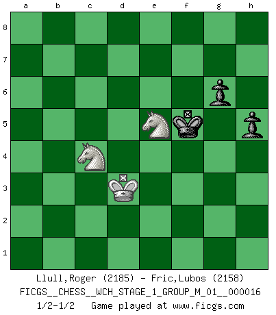 Last move : 1/2-1/2 2016 September 29 9:8:38 [Event "FICGS__CHESS__WCH_STAGE_1_GROUP_M_01__000016"] [Site "FICGS"] [Date "2016.03.02"] [Round "1"] [White "Llull,Roger"] [Black "Fric,Lubos"] [Result "1/2-1/2"] [WhiteElo "2185"] [BlackElo "2158"] 1.e4 e5 2.Nf3 Nc6 3.Bb5 a6 4.Ba4 Nf6 5.O-O Be7 6.Re1 b5 7.Bb3 d6 8.c3 O-O 9.h3 Na5 10.Bc2 c5 11.d4 Nd7 12.d5 Nb6 13.Nbd2 Qc7 14.b3 c4 15.b4 Nb7 16.a4 bxa4 17.Nf1 a5 18.Be3 axb4 19.cxb4 Bd7 20.Ra3 Rfc8 21.N1d2 c3 22.Nb1 Nc4 23.Rxc3 a3 24.Bb3 a2 25.Bxa2 Rxa2 26.Nfd2 Nxe3 27.Rxc7 Nxd1 28.Rxd7 Bg5 29.Rxd1 Rb8 30.Rc7 Rb2 31.Nf3 Bh6 32.Rc4 Nd8 33.Nbd2 R2xb4 34.Rc7 Nb7 35.Nc4 g6 36.Ra1 Bf8 37.Nfd2 Nc5 38.Rc6 Rd8 39.Ra5 Rb7 40.f3 f5 41.Kf2 Rf7 42.Ke2 fxe4 43.fxe4 Re8 44.Rb5 Rd7 45.h4 Red8 46.Rbxc5 dxc5 47.Nxe5 Re7 48.Ng4 Bg7 49.Ne3 Bd4 50.d6 Re6 51.Nec4 Rb8 52.Kd3 Kf8 53.Nb6 Rd8 54.Ndc4 Kf7 55.Rc7+ Ke8 56.Nc8 Kf8 57.Rc6 Kg7 58.g4 h5 59.Rc7+ Kh8 60.g5 Bf2 61.Re7 Rxe7 62.Nxe7 Kg7 63.Nc6 Ra8 64.d7 Bxh4 65.d8R Rxd8+ 66.Nxd8 Bxg5 67.Ne6+ Kf6 68.Nxc5 Bf4 69.e5+ Bxe5 70.Nd7+ Kf5 71.Ndxe5 1/2-1/2 Ruy Lopez : Closed Kingside Castling by player White (move 5) Kingside Castling by player Black (move 8) Promotion Rook by player White (move 65) 10 pieces endgame at move 66 : White KNNPP , Black KBPPP WHITE : King + 2 Knights 2 Pawns BLACK : King + 1 Bishop 3 Pawns 9 pieces endgame at move 66 : White KNNP , Black KBPPP WHITE : King + 2 Knights 1 Pawn BLACK : King + 1 Bishop 3 Pawns 8 pieces endgame at move 68 : White KNNP , Black KBPP WHITE : King + 2 Knights 1 Pawn BLACK : King + 1 Bishop 2 Pawns 7 pieces endgame at move 69 : White KNN , Black KBPP WHITE : King + 2 Knights BLACK : King + 1 Bishop 2 Pawns 6 pieces endgame at move 71 : White KNN , Black KPP WHITE : King + 2 Knights BLACK : King + 2 Pawns This chess game ended in a draw. Follow this game move after move (download)To avoid losing a piece, many a person has lost the game. (Savielly Tartakover) Auf Remis zu spielen ist gewissermaßen ein Verbrechen gegen das Schachspiel. (Mikhail Nekhemyevich Tal) a manera como él juega al Ajedrez, demuestra la completa naturaleza de un hombre. (Stanley Ellin) Horreur, mais aussi harmonie suprême : qu'y avait-il en effet au monde en dehors des échecs ? Le brouillard, l'inconnu, le non-être... (Vladimir Nabokov) Once you start thinking you have nothing left to learn, you have everything to learn. (Steve Badget)