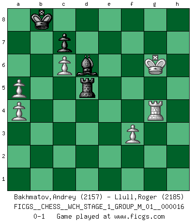 Last move : 0-1 2016 July 18 6:31:13 [Event "FICGS__CHESS__WCH_STAGE_1_GROUP_M_01__000016"] [Site "FICGS"] [Date "2016.03.02"] [Round "1"] [White "Bakhmatov,Andrey"] [Black "Llull,Roger"] [Result "0-1"] [WhiteElo "2157"] [BlackElo "2185"] 1.d4 Nf6 2.c4 g6 3.Nc3 Bg7 4.e4 d6 5.Nf3 O-O 6.h3 e5 7.d5 Nh5 8.g3 f5 9.exf5 gxf5 10.Ng5 Nf6 11.g4 Qe7 12.gxf5 Bxf5 13.h4 h6 14.Bh3 Bxh3 15.Nxh3 Qf7 16.Be3 Nbd7 17.Qe2 Qh5 18.Kd2 Qxe2+ 19.Kxe2 Nh5 20.Rag1 Kh7 21.Kd1 Rf7 22.Ne4 Bf8 23.b3 Be7 24.Kc2 a6 25.Rg2 Rc8 26.Nhg5+ hxg5 27.hxg5 Kg6 28.Nf6 Nf4 29.Bxf4 exf4 30.Nxd7 Bxg5 31.Rhg1 Rf5 32.Re1 f3 33.Rg3 Rh8 34.Kd3 Kf7 35.Ke4 Rf4+ 36.Kd3 Bh4 37.Rh3 Rh6 38.Kd2 Rf5 39.Reh1 Bg5+ 40.Kd3 Rxh3 41.Rxh3 Ke8 42.Rh7 Be7 43.Ke4 Rg5 44.Nb8 Rg4+ 45.Kxf3 Rh4 46.Rg7 Rh8 47.Ke4 a5 48.a4 Kf8 49.Rg3 Kf7 50.Rf3+ Ke8 51.b4 Kd8 52.bxa5 Kc8 53.Nc6 Rh4+ 54.Rf4 bxc6 55.dxc6 d5+ 56.cxd5 Rh2 57.f3 Bd6 58.Rg4 Kb8 59.Kf5 Rh5+ 60.Kg6 Rxd5 0-1 King's Indian : 5.Nf3 Kingside Castling by player Black (move 5) 10 pieces endgame at move 60 : White KRPPPP , Black KRBP WHITE : King + 1 Rook 4 Pawns BLACK : King + 1 Rook 1 Bishop 1 Pawn Player Black won this chess game. Follow this game move after move (download)You are for me the Queen on d8 and I am the Pawn on d7 !! (Eduard Gufeld) Es ist besser die Steine des Gegners zu opfern. (Savielly Grigorievitsch Tartakower) El Ajedrez es un expediente tonto que hace creer a la gente inactiva que hacen una cosa muy astuta cuando solamente estan perdiendo su tiempo. (George Bernard Shaw) Mon pion favori sur ma case favorite ! Bronstein en parlant d'un coup de pion en h5 quand il avait les Noirs. In my experience, there's no such thing as luck. (Obi-Wan Kenobi in Star Wars ep.4)