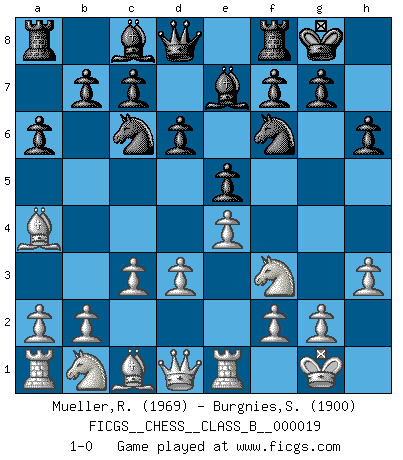 Last move : 1-0 2007 May 13 21:7:27 [Event "FICGS__CHESS__CLASS_B__000019"] [Site "FICGS"] [Date "2007.03.22"] [Round "1"] [White "Mueller,Robert"] [Black "Burgnies,Stephane"] [Result "1-0"] [WhiteElo "1969"] [BlackElo "1900"] 1.e4 e5 2.Nf3 Nc6 3.Bb5 a6 4.Ba4 Nf6 5.O-O Be7 6.d3 d6 7.c3 O-O 8.h3 h6 9.Re1 1-0 This chess game has been lost on time (started : 2007.03.22 16:10:21) Ruy Lopez : Closed defense Kingside Castling by player White (move 5) Kingside Castling by player Black (move 7) Player White won this chess game. Follow this game move after move (download)Chess is a matter of delicate judgment, knowing when to punch and how to duck. (Bobby Fischer) Obwohl ich alt bin, darf mir niemand den Finger in den Mund stecken, sonst beisse ich. (Wilhelm Steinitz) Aquel que toma al Peón de Caballo de la Reina, se pasará la noche a dormir en la calle. (Anónimo) Les échecs sont utiles à l'exercice de la faculté de penser et à celle de l'imagination. Car nous devons posséder une méthode élaborée pour atteindre des buts partout où nous devons conduire notre raison. (Leibnitz) Fortune favours the audacious. (Desiderius Erasmus)