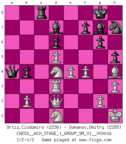 Last move : 1/2-1/2 2016 June 28 0:58:52 [Event "FICGS__CHESS__WCH_STAGE_1_GROUP_SM_01__000016"] [Site "FICGS"] [Date "2016.03.02"] [Round "1"] [White "Ortiz,Clodomiro"] [Black "Domanov,Dmitry"] [Result "1/2-1/2"] [WhiteElo "2236"] [BlackElo "2285"] 1.d4 Nf6 2.c4 g6 3.Nc3 Bg7 4.e4 d6 5.Bd3 O-O 6.Nge2 c5 7.d5 a6 8.a4 e6 9.O-O exd5 10.cxd5 Nbd7 11.Ng3 h5 12.Bg5 Qc7 13.Kh1 Nh7 14.Be7 Re8 15.Bh4 Ne5 16.Be2 Qb6 17.Qc1 c4 18.f4 Nd3 19.Bxd3 cxd3 20.Rf3 Bd7 21.Rxd3 Qb4 22.Qd2 b5 23.axb5 axb5 24.Rc1 Qb3 25.h3 Rec8 26.Nd1 Qa4 27.Nc3 Qb3 28.Nge2 b4 29.Nd1 Qa4 30.Rxc8+ Rxc8 31.Nd4 1/2-1/2 King's Indian : 4.e4 Kingside Castling by player Black (move 5) Kingside Castling by player White (move 9) This chess game ended in a draw. Follow this game move after move (download)The passed Pawn is a criminal, who should be kept under lock and key. Mild measures, such as police surveillance, are not sufficient. (Aaron Nimzovich) Ein Remis kann durch Wiederholung von drei Zügen oder durch einen schlechte Zug erreicht werden. (Savielly Grigorievitsch Tartakower) Todavía soy una víctima del Ajedrez. Tiene toda la belleza del arte y mucho mas. No puede ser comercializado. El Ajedrez es mas puro que el arte en su posición social. (Marcel Duchamp) Je crois qu'il existe des manières très spécifiques de jouer efficacement contre une machine. Evidemment, nous n'avons aucune chance en technique pure, parce que l'ordinateur calcule de manière parfaite. Mais lorsque nous faisons appel à notre cerveau, en utilisant l'intuition et la compréhension, alors nous restons beaucoup plus forts. (Anatoli Karpov) Statistics can be made to prove anything - even the truth. (Author unknown)