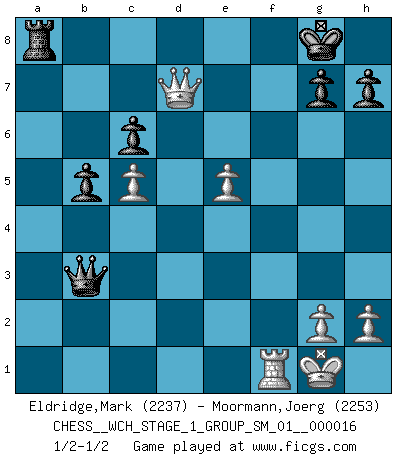 Last move : 1/2-1/2 2016 July 27 5:28:21 [Event "FICGS__CHESS__WCH_STAGE_1_GROUP_SM_01__000016"] [Site "FICGS"] [Date "2016.03.02"] [Round "1"] [White "Eldridge,Mark"] [Black "Moormann,Joerg"] [Result "1/2-1/2"] [WhiteElo "2237"] [BlackElo "2253"] 1.d4 d5 2.c4 e6 3.Nc3 c6 4.e4 dxe4 5.Nxe4 Bb4+ 6.Bd2 Qxd4 7.Bxb4 Qxe4+ 8.Be2 Na6 9.Ba5 b6 10.Qd6 Bd7 11.Bc3 f6 12.Nf3 Nh6 13.Rd1 Rd8 14.Qa3 Bc8 15.Nd2 Qf4 16.Bh5+ Nf7 17.O-O Qd6 18.b4 O-O 19.Ne4 Qe7 20.c5 Rd5 21.Be2 b5 22.Rde1 Nc7 23.Qb2 e5 24.f4 R5d8 25.Bh5 Nd5 26.Bxf7+ Rxf7 27.Nd6 R7f8 28.Bd2 Be6 29.fxe5 f5 30.Qd4 f4 31.Bxf4 Qh4 32.Re4 a5 33.bxa5 Ra8 34.a3 Nxf4 35.R1xf4 Rxf4 36.Rxf4 Qe1+ 37.Rf1 Qxa5 38.Nf5 Bxf5 39.Rxf5 Qxa3 40.Rf1 Qb3 41.Qd7 1/2-1/2 QGD : Semi-Slav, Marshall gambit Kingside Castling by player White (move 17) Kingside Castling by player Black (move 18) This chess game ended in a draw. Follow this game move after move (download)Look at Garry Kasparov. After he loses, invariably he wins the next game. He just kills the next guy. That's something that we have to learn to be able to do. (Maurice Ashley) Drei Punkte vor allen anderen ist wie einer, der im weißen Anzug posiert, während der Rest in Müllsäcke gekleidet dasteht. (Viktor Kortschnoi) La enorme capacidad mental, en la que sin ella no puede un jugador de Ajedrez existir, es demasiado requerida por el Ajedrez al grado de que nunca podrá liberar su mente de este juego. (Albert Einstein) Horreur, mais aussi harmonie suprême : qu'y avait-il en effet au monde en dehors des échecs ? Le brouillard, l'inconnu, le non-être... (Vladimir Nabokov) Perception is reality. (Immanuel Kant)
