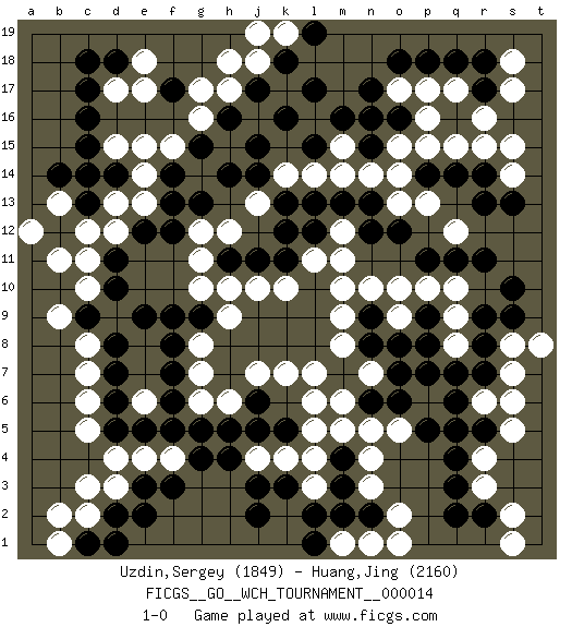Last move : 1-0 2017 January 4 10:15:16 [Event "FICGS__GO__WCH_TOURNAMENT__000014"] [Site "FICGS"] [Date "2016.03.02"] [Round "1"] [Black "Uzdin,Sergey"] [White "Huang,Jing"] [Result "1-0"] [Rating 1 "1849"] [Rating 2 "2160"] 1.q16 d4 2.q4 d17 3.c15 d12 4.f17 d15 5.d14 e15 6.c16 e17 7.c17 e14 8.f3 c6 9.d2 c3 10.j3 r6 11.r8 r3 12.q3 r4 13.q5 s6 14.p7 k4 15.k3 l4 16.f5 k7 17.k16 h17 18.h16 g17 19.j17 g16 20.n17 r16 21.r17 r15 22.r11 q17 23.q18 p17 24.p18 s17 25.r18 o17 26.o16 p16 27.o18 p15 28.f7 d9 29.b12 b11 30.c13 c12 31.r13 s18 32.m7 m6 33.n6 l6 34.m3 m8 35.n8 m9 36.n9 m10 37.f9 g8 38.f8 h10 39.h14 h12 40.k13 n14 41.n15 o15 42.n16 o13 43.k11 k10 44.j11 j10 45.h11 e6 46.f6 n5 47.r2 s2 48.q2 s1 49.m4 m5 50.j5 h6 51.h5 g7 52.d8 c8 53.d7 c7 54.d10 c10 55.e9 c2 56.e3 l3 57.l2 n3 58.n2 n4 59.m2 s8 60.s9 t8 61.r7 s7 62.f12 b13 63.b14 a12 64.c9 b9 65.d18 e18 66.c18 s14 67.s13 n10 68.o6 j18 69.k18 h18 70.g15 f15 71.s10 p10 72.d6 l14 73.l15 k14 74.j14 k19 75.l19 j19 76.l17 l7 77.g9 h9 78.n12 m12 79.m13 m14 80.l13 l11 81.l12 m11 82.n13 n7 83.o7 q9 84.p8 q12 85.o12 p13 86.r9 o5 87.q6 o2 88.r14 s15 89.p9 q10 90.q11 o9 91.o8 o10 92.p11 g14 93.g13 h15 94.j15 j16 95.j6 j7 96.h16 q8 97.q7 j16 98.q14 q15 99.h16 d13 100.c14 j16 101.p14 o14 102.h16 d3 103.e2 j16 104.r5 s5 105.h16 g10 106.g15 g11 107.f14 j13 108.k12 g12 109.p5 n1 110.d5 c5 111.c1 b1 112.d1 b2 113.d11 c11 114.e12 e13 115.f13 j4 116.h4 m1 117.k5 l5 118.l1 o1 119.j2 m15 120.m16 e4 121.e5 f4 122.g4 g6 123.g5 1-0 This go game has been lost on time (started : 2016.03.02 2:49:6) Here are the names of the openings (joseki) played in the four corners : Corner d16 : d17 c15 Komoku (Somok, Xiao~mu`) 3-4 Point. The komoku (3-4) point is the traditional corner enclosure move.. Ikken Kakari (Hankan Keolch'im, Yi Gua`jiao~, 1-Space Low Pincer). The small knight move is the basic approach move to the 3-4 point stone. It has been continually used for over four centuries. There are limitless variations, with new moves constantly being discovered. Black 2 opens the door to a treaure store of joseki. Corner d4 : d4 f3 Hoshi (Hwajeom, Seongjeom, Xingwei`) 4-4 Point. The star or hoshi (4-4) point, emphasizing influence at the potential expense of territory. Ikken Kakari (Hankan Keolch'im, Yi Gua`jiao~, 1-Space Low Approach). Black 2 is the standard approach move to the 4-4. Corner q4 : q4 r6 Hoshi (Hwajeom, Seongjeom, Xingwei`) 4-4 Point. The star or hoshi (4-4) point, emphasizing influence at the potential expense of territory. Ikken Kakari (Hankan Keolch'im, Yi Gua`jiao~, 1-Space Low Approach). White 2 is the standard approach move to the 4-4. Player Black won this Go (weiqi, baduk) game. Follow this game move after move (download)Learn the eye-stealing tesuji. (Anonymous) Everybody lies. (Gregory House, House M.D.)