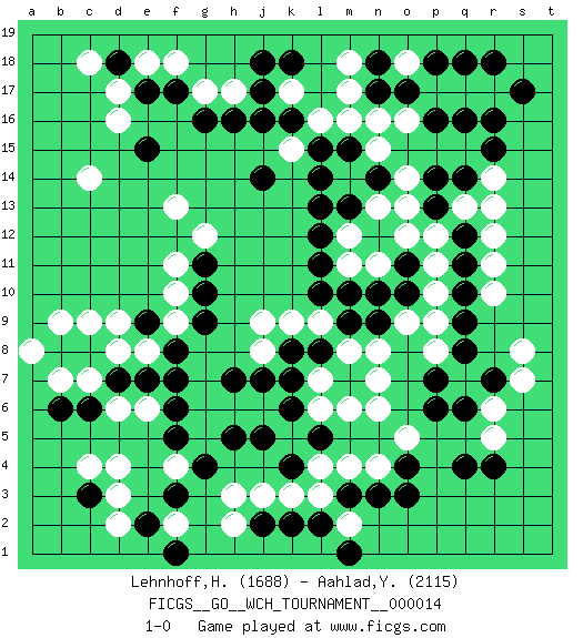 Last move : 1-0 2016 December 23 1:59:4 [Event "FICGS__GO__WCH_TOURNAMENT__000014"] [Site "FICGS"] [Date "2016.03.02"] [Round "1"] [Black "Lehnhoff,Heinz-Georg"] [White "Aahlad,Yeturu"] [Result "1-0"] [Rating 1 "1688"] [Rating 2 "2115"] 1.q16 d4 2.q4 d16 3.f17 c14 4.d18 g17 5.g16 h17 6.h16 f18 7.j17 e18 8.e17 d17 9.e15 c18 10.j14 r10 11.j18 r6 12.o3 r14 13.f3 h3 14.f5 d6 15.h5 l3 16.l5 n4 17.n3 m4 18.q6 q7 19.p6 n6 20.p7 n8 21.q8 s8 22.m7 n7 23.m9 m8 24.l8 l9 25.m10 k9 26.k8 j8 27.j7 j9 28.h7 l6 29.k6 m6 30.k7 f9 31.e7 d8 32.d7 c7 33.c8 c9 34.b8 e6 35.f7 b9 36.e9 e8 37.f8 d9 38.g9 f10 39.g10 f11 40.o10 o9 41.c6 b7 42.b6 a8 43.q10 p9 44.q9 p10 45.q11 m11 46.c3 c4 47.l11 m12 48.l10 p11 49.r7 r11 50.q12 r12 51.l12 d3 52.j2 j3 53.k2 k3 54.l2 p12 55.p13 o13 56.m13 n13 57.q14 m14 58.l13 n16 59.n17 m17 60.o17 o16 61.r15 r13 62.p16 s7 63.g11 r5 64.r4 r17 65.r16 q13 66.p14 l16 67.m15 n15 68.l15 m16 69.q18 k15 70.l14 n11 71.n14 o14 72.n9 p8 73.o11 o12 74.n10 p17 75.p18 k5 76.k4 m2 77.m3 l4 78.j5 h2 79.e2 d2 80.m1 f13 81.k16 g12 82.f6 f4 83.g4 f2 84.f1 q17 85.s17 o18 86.n18 m18 87.r18 k17 88.j16 l7 89.k18 o5 90.o4 1-0 Here are the names of the openings (joseki) played in the four corners : Corner d16 : d16 f17 Hoshi (Hwajeom, Seongjeom, Xingwei`) 4-4 Point. The star or hoshi (4-4) point, emphasizing influence at the potential expense of territory. Ikken Kakari (Hankan Keolch'im, Yi Gua`jiao~, 1-Space Low Approach). Black 2 is the standard approach move to the 4-4. Corner q4 : q4 r6 Hoshi (Hwajeom, Seongjeom, Xingwei`) 4-4 Point. The star or hoshi (4-4) point, emphasizing influence at the potential expense of territory. Ikken Kakari (Hankan Keolch'im, Yi Gua`jiao~, 1-Space Low Approach). White 2 is the standard approach move to the 4-4. Corner q16 : q16 r14 Hoshi (Hwajeom, Seongjeom, Xingwei`) 4-4 Point. The star or hoshi (4-4) point, emphasizing influence at the potential expense of territory. Ikken Kakari (Hankan Keolch'im, Yi Gua`jiao~, 1-Space Low Approach). White 2 is the standard approach move to the 4-4. Corner d4 : d4 f3 Hoshi (Hwajeom, Seongjeom, Xingwei`) 4-4 Point. The star or hoshi (4-4) point, emphasizing influence at the potential expense of territory. Ikken Kakari (Hankan Keolch'im, Yi Gua`jiao~, 1-Space Low Approach). Black 2 is the standard approach move to the 4-4. Player Black won this Go (weiqi, baduk) game. Follow this game move after move (download)Connect with good shape. (Anonymous) They say in chess you've got to kill the queen, and then you mate it... Oh I, do you ? (Red Hot Chili Peppers, Fortune faded)