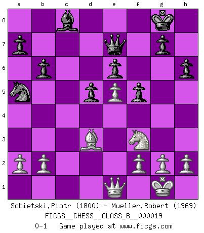 Last move : 0-1 2007 July 25 0:34:22 [Event "FICGS__CHESS__CLASS_B__000019"] [Site "FICGS"] [Date "2007.03.22"] [Round "1"] [White "Sobietski,Piotr"] [Black "Mueller,Robert"] [Result "0-1"] [WhiteElo "1800"] [BlackElo "1969"] 1.e4 e6 2.d4 d5 3.e5 c5 4.c3 Qb6 5.Nf3 Nc6 6.Bd3 cxd4 7.cxd4 Bd7 8.O-O Nxd4 9.Nxd4 Qxd4 10.Qe2 Ne7 11.Nd2 Nc6 12.Nf3 Qb6 13.Be3 Bc5 14.Bxc5 Qxc5 15.Rac1 Qb6 16.Rfe1 Rc8 17.Qd2 O-O 18.Rc3 f5 19.Bf1 Na5 20.Rec1 Rxc3 21.Rxc3 Rc8 22.Rxc8+ Bxc8 23.Qg5 Qc7 24.Bd3 h6 25.Qe3 b6 26.Qe1 Qe7 0-1 French : Advance variation Kingside Castling by player White (move 8) Kingside Castling by player Black (move 17) Player Black won this chess game. Follow this game move after move (download)The tactician knows what to do when there is something to do; whereas the strategian knows what to do when there is nothing to do. (Gerald Abrahams) Im Reiche der Wirklichkeit ist man nie so glücklich wie im Reiche der Gedanken. (Arthur Schopenhauer) La enorme capacidad mental, en la que sin ella no puede un jugador de Ajedrez existir, es demasiado requerida por el Ajedrez al grado de que nunca podrá liberar su mente de este juego. (Albert Einstein) Le thème de l'attaque double intervient d'une manière ou d'une autre dans l'immense majorité des combinaisons. (Youri Averbakh) There is a computer disease that anybody who works with computers knows about. It's a very serious disease and it interferes completely with the work. The trouble with computers is that you 'play' with them ! (Richard P. Feynman)
