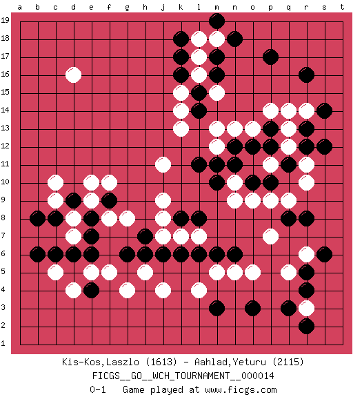 Last move : 0-1 2016 July 28 19:39:48 [Event "FICGS__GO__WCH_TOURNAMENT__000014"] [Site "FICGS"] [Date "2016.03.02"] [Round "1"] [Black "Kis-Kos,Laszlo"] [White "Aahlad,Yeturu"] [Result "0-1"] [Rating 1 "1613"] [Rating 2 "2115"] 1.r16 d16 2.q3 d4 3.p17 q5 4.q8 o5 5.o3 m5 6.m3 r3 7.r2 r10 8.r12 q12 9.q11 r11 10.p12 q13 11.r13 r14 12.s14 q14 13.s12 p9 14.p10 q9 15.r4 o13 16.o12 n13 17.n12 m13 18.l11 k13 19.k16 l16 20.l15 k15 21.m16 l17 22.m17 m15 23.l14 k14 24.k17 l18 25.k18 m18 26.n18 j11 27.m19 n9 28.m10 m12 29.m11 j9 30.l8 k7 31.o10 o9 32.r5 n10 33.n11 p11 34.p13 p14 35.r8 r6 36.s6 p7 37.l6 l7 38.m6 l4 39.n6 n5 40.k6 j4 41.k8 j7 42.j6 j8 43.g6 g4 44.h7 h5 45.h6 f8 46.e6 d8 47.c6 f5 48.e7 c10 49.e8 e9 50.f9 g8 51.d9 e10 52.c8 c9 53.b8 c5 54.b6 d7 55.d6 f10 56.e4 e5 0-1 Here are the names of the openings (joseki) played in the four corners : Corner q4 : q3 q5 Komoku (Somok, Xiao~mu`) 3-4 Point. The komoku (3-4) point is the traditional corner enclosure move.. Ikken Takagakari (Hankan Nop'dakeolch'im, Yi Gaogua`jiao~, 1-Space High Approach). The 5-4 approach move has become more popular in modern times, as modern Go emphasizes speed and influence. Player White won this Go (weiqi, baduk) game. Follow this game move after move (download)If you have lost four corners, resign. (Anonymous) When the going gets tactical, the computers get going. (Hyatt)