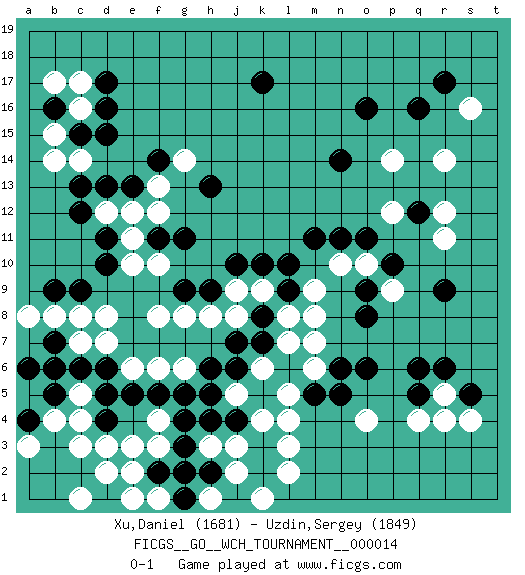 Last move : 0-1 2016 June 29 11:0:2 [Event "FICGS__GO__WCH_TOURNAMENT__000014"] [Site "FICGS"] [Date "2016.03.02"] [Round "1"] [Black "Xu,Daniel"] [White "Uzdin,Sergey"] [Result "0-1"] [Rating 1 "1681"] [Rating 2 "1849"] 1.q16 d3 2.d16 q4 3.d5 c5 4.c6 c4 5.d6 f3 6.d10 r14 7.o16 s16 8.r17 r11 9.k17 k4 10.q12 p14 11.n14 r12 12.r6 r5 13.q6 o4 14.r9 c14 15.c12 c17 16.d17 c16 17.d15 b14 18.e13 d8 19.j4 j5 20.k3 j3 21.h4 h3 22.g4 l3 23.k2 l2 24.k5 l4 25.g3 j2 26.h2 k1 27.j6 p9 28.s5 s4 29.q5 r4 30.o6 m6 31.o8 m8 32.o9 p12 33.p10 f8 34.h5 j8 35.g9 g8 36.h9 h8 37.k10 l8 38.m11 b8 39.b7 c7 40.b5 f4 41.f5 g6 42.h6 f6 43.g5 e6 44.d4 c3 45.f2 e3 46.e5 b4 47.d1 b1 48.a2 a5 49.b6 h1 50.g2 e2 51.e1 c1 52.b2 k6 53.c2 d2 54.a1 c1 55.b1 d7 56.a6 a3 57.a4 f1 58.b3 c1 59.d1 e1 60.g1 c1 61.k7 a3 62.l6 l7 63.k8 k9 64.l9 j9 65.m5 l5 66.n6 k6 67.c9 c8 68.l6 m7 69.n5 k6 70.b9 a8 71.l6 m9 72.l10 k6 73.c15 b15 74.l6 n10 75.n11 k6 76.b16 b17 77.l6 o10 78.o11 k6 79.j7 j5 80.j10 f10 81.g11 e10 82.f11 d12 83.d11 e11 84.d13 e12 85.c13 f12 86.h13 f13 87.f14 g14 0-1 Here are the names of the openings (joseki) played in the four corners : Corner d4 : d3 d5 Komoku (Somok, Xiao~mu`) 3-4 Point. The komoku (3-4) point is the traditional corner enclosure move.. Ikken Takagakari (Hankan Nop'dakeolch'im, Yi Gaogua`jiao~, 1-Space High Approach). The 5-4 approach move has become more popular in modern times, as modern Go emphasizes speed and influence. Corner q16 : q16 r14 Hoshi (Hwajeom, Seongjeom, Xingwei`) 4-4 Point. The star or hoshi (4-4) point, emphasizing influence at the potential expense of territory. Ikken Kakari (Hankan Keolch'im, Yi Gua`jiao~, 1-Space Low Approach). White 2 is the standard approach move to the 4-4. Corner q4 : q4 r6 Hoshi (Hwajeom, Seongjeom, Xingwei`) 4-4 Point. The star or hoshi (4-4) point, emphasizing influence at the potential expense of territory. Ikken Kakari (Hankan Keolch'im, Yi Gua`jiao~, 1-Space Low Approach). Black 2 is the standard approach move to the 4-4. Corner d16 : d16 c14 Hoshi (Hwajeom, Seongjeom, Xingwei`) 4-4 Point. The star or hoshi (4-4) point, emphasizing influence at the potential expense of territory. Ikken Kakari (Hankan Keolch'im, Yi Gua`jiao~, 1-Space Low Approach). White 2 is the standard approach move to the 4-4. Player White won this Go (weiqi, baduk) game. Follow this game move after move (download)Connect with good shape. (Anonymous) An expert is a man who has made all the mistakes which can be made in a very narrow field. (Niels Bohr)
