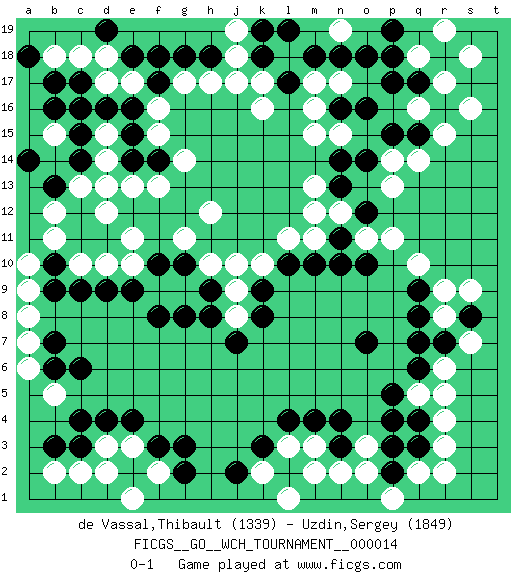 Last move : 0-1 2016 October 4 2:11:9 [Event "FICGS__GO__WCH_TOURNAMENT__000014"] [Site "FICGS"] [Date "2016.03.02"] [Round "1"] [Black "de Vassal,Thibault"] [White "Uzdin,Sergey"] [Result "0-1"] [Rating 1 "1339"] [Rating 2 "1849"] 1.d4 q16 2.q4 d17 3.c15 c13 4.e15 f16 5.f14 c10 6.c17 c18 7.b17 r6 8.d16 e17 9.d13 d12 10.c14 e13 11.b13 d14 12.c12 o3 13.p5 r3 14.q3 r4 15.k3 k16 16.c6 b12 17.d13 q5 18.p4 c13 19.c11 b11 20.d11 d13 21.a14 e10 22.d9 d10 23.c9 q2 24.p2 r2 25.p3 q10 26.o7 k10 27.k8 r17 28.e9 d3 29.c3 e3 30.e4 c2 31.b3 b2 32.f10 e11 33.f3 f2 34.e2 d2 35.g2 e1 36.g3 h10 37.h9 g9 38.g10 j9 39.h8 j8 40.j7 g11 41.g8 b18 42.k9 j10 43.l10 l11 44.m10 f9 45.f8 h12 46.a18 b15 47.b16 d15 48.e16 f15 49.e14 g14 50.f17 f13 51.c16 g17 52.f18 d18 53.g18 h17 54.h18 j17 55.e18 j18 56.d19 m11 57.n10 o11 58.n11 n12 59.o10 p11 60.q6 r5 61.q7 r8 62.r7 s7 63.s8 s9 64.q8 r9 65.q9 a8 66.b9 a9 67.b10 a10 68.b7 b5 69.c4 a7 70.b6 a6 71.r16 r15 72.q17 s16 73.p17 n17 74.n16 m17 75.o16 p1 76.n13 m13 77.o12 m12 78.n14 p14 79.o14 p13 80.p15 o2 81.n4 m3 82.n3 n2 83.m4 l3 84.l4 k2 85.l2 m2 86.j2 l1 87.o18 q18 88.r18 s18 89.p18 r19 90.n18 m15 91.q15 q14 92.m18 n15 93.k18 j19 94.l17 m16 95.k19 k17 96.p19 l18 97.l19 n19 0-1 Here are the names of the openings (joseki) played in the four corners : Corner d16 : d17 c15 Komoku (Somok, Xiao~mu`) 3-4 Point. The komoku (3-4) point is the traditional corner enclosure move.. Ikken Kakari (Hankan Keolch'im, Yi Gua`jiao~, 1-Space Low Pincer). The small knight move is the basic approach move to the 3-4 point stone. It has been continually used for over four centuries. There are limitless variations, with new moves constantly being discovered. Black 2 opens the door to a treaure store of joseki. Corner q4 : q4 r6 Hoshi (Hwajeom, Seongjeom, Xingwei`) 4-4 Point. The star or hoshi (4-4) point, emphasizing influence at the potential expense of territory. Ikken Kakari (Hankan Keolch'im, Yi Gua`jiao~, 1-Space Low Approach). White 2 is the standard approach move to the 4-4. Player White won this Go (weiqi, baduk) game. Follow this game move after move (download)If you have won four corners, resign. (Anonymous) The bottom line is always the bottom line. (Johann Piek)