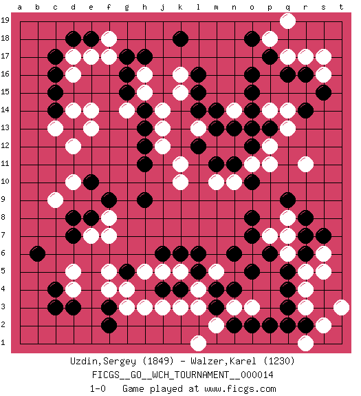 Last move : 1-0 2016 April 15 13:2:33 [Event "FICGS__GO__WCH_TOURNAMENT__000014 "] [Site "FICGS"] [Date "2016.03.02"] [Round "1"] [Black "Uzdin,Sergey "] [White "Walzer,Karel "] [Result "1-0"] [Rating 1 "1849"] [Rating 2 "1230"] 1.q16 d4 2.q4 d16 3.f3 h3 4.c3 f4 5.c4 d5 6.d3 q14 7.o16 r17 8.r16 q17 9.p17 s16 10.s15 s17 11.r14 p18 12.o18 q19 13.b6 o3 14.o5 l4 15.d7 e7 16.c14 d14 17.d13 e14 18.c15 e13 19.c16 d17 20.e8 f8 21.d8 f7 22.o8 q8 23.r6 r3 24.q3 r4 25.r2 s2 26.p2 r1 27.q2 r5 28.q5 s6 29.s7 s5 30.r8 q6 31.r7 q7 32.q9 o6 33.p6 p7 34.o7 t3 35.n6 k16 36.m3 l3 37.m4 d12 38.c17 c9 39.d18 e17 40.e18 f17 41.l5 c13 42.k4 k3 43.j4 g3 44.f2 j3 45.g5 g4 46.j6 f5 47.e10 d10 48.f9 m2 49.n2 l1 50.h9 n3 51.o2 m5 52.n4 k5 53.l6 j5 54.k6 h5 55.k18 n14 56.h17 h16 57.g16 h15 58.g17 f18 59.g15 g14 60.h14 j14 61.h13 j13 62.l14 l13 63.l16 k15 64.l15 q13 65.h12 j12 66.h11 k10 67.o14 o13 68.n13 n12 69.m13 m12 70.m14 p14 71.o15 p11 72.o12 o11 73.p13 p12 74.o13 r11 75.n11 n10 76.m11 m10 77.l12 k11 78.o10 1-0 Here are the names of the openings (joseki) played in the four corners : Corner d4 : d4 f3Hoshi (Hwajeom, Seongjeom, Xingwei`) 4-4 Point. The star or hoshi (4-4) point, emphasizing influence at the potential expense of territory.Ikken Kakari (Hankan Keolch'im, Yi Gua`jiao~, 1-Space Low Approach). Black 2 is the standard approach move to the 4-4. Corner q16 : q16 q14Hoshi (Hwajeom, Seongjeom, Xingwei`) 4-4 Point. The star or hoshi (4-4) point, emphasizing influence at the potential expense of territory.Ikken Takagakari (Hankan Nop'dakeolch'im, Yi Gaojia, 1-Space High Approach). Black typically responds at 6-4 or 3-10. Black 4-10 is played when Black finds play on the right side advantageous. Black 4-8 or 3-8 may be played when Black has support at top. Corner q4 : q4 o3Hoshi (Hwajeom, Seongjeom, Xingwei`) 4-4 Point. The star or hoshi (4-4) point, emphasizing influence at the potential expense of territory.Ikken Kakari (Hankan Keolch'im, Yi Gua`jiao~, 1-Space Low Approach). White 2 is the standard approach move to the 4-4. Corner d16 : d16 c14Hoshi (Hwajeom, Seongjeom, Xingwei`) 4-4 Point. The star or hoshi (4-4) point, emphasizing influence at the potential expense of territory.Ikken Kakari (Hankan Keolch'im, Yi Gua`jiao~, 1-Space Low Approach). Black 2 is the standard approach move to the 4-4. Player Black won this Go (weiqi, baduk) game.Follow this game move after move (download ) The comb formation is alive. (Anonymous) The best teachers teach from the heart, not from the book. (Author unknown)