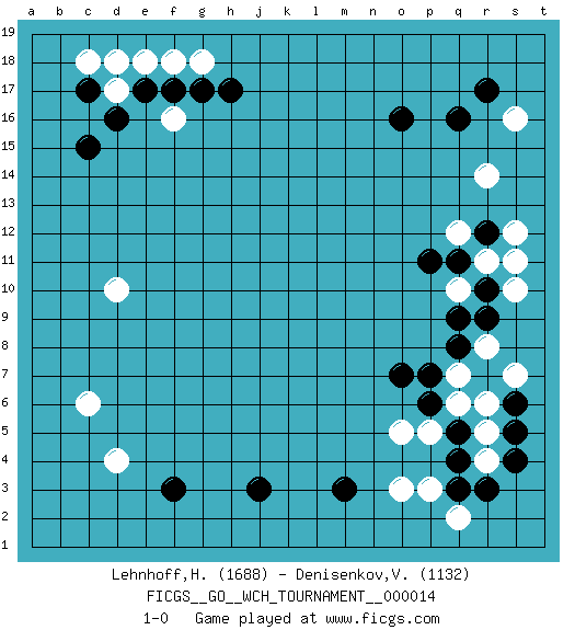 Last move : 1-0 2016 July 17 13:12:8 [Event "FICGS__GO__WCH_TOURNAMENT__000014 "] [Site "FICGS"] [Date "2016.03.02"] [Round "1"] [Black "Lehnhoff,Heinz-Georg "] [White "Denisenkov,Valentin "] [Result "1-0"] [Rating 1 "1688"] [Rating 2 "1132"] 1.q16 d4 2.q4 d17 3.c15 f16 4.c17 c18 5.d16 e18 6.e17 d18 7.f17 f18 8.g17 g18 9.h17 r14 10.o16 s16 11.r17 q10 12.r12 q12 13.q11 r11 14.p11 s12 15.r10 s11 16.q9 s10 17.r9 o3 18.m3 o5 19.j3 q6 20.f3 c6 21.r3 q2 22.s6 r5 23.s5 d10 24.o7 r4 25.q3 p3 26.p6 p5 27.q5 r6 28.s4 s7 29.r7 q7 30.p7 r8 31.q8 1-0 Here are the names of the openings (joseki) played in the four corners : Corner d16 : d17 c15Komoku (Somok, Xiao~mu`) 3-4 Point. The komoku (3-4) point is the traditional corner enclosure move..Ikken Kakari (Hankan Keolch'im, Yi Gua`jiao~, 1-Space Low Pincer). The small knight move is the basic approach move to the 3-4 point stone. It has been continually used for over four centuries. There are limitless variations, with new moves constantly being discovered. Black 2 opens the door to a treaure store of joseki. Corner q16 : q16 r14Hoshi (Hwajeom, Seongjeom, Xingwei`) 4-4 Point. The star or hoshi (4-4) point, emphasizing influence at the potential expense of territory.Ikken Kakari (Hankan Keolch'im, Yi Gua`jiao~, 1-Space Low Approach). White 2 is the standard approach move to the 4-4. Corner d4 : d4 j3Hoshi (Hwajeom, Seongjeom, Xingwei`) 4-4 Point. The star or hoshi (4-4) point, emphasizing influence at the potential expense of territory. Player Black won this Go (weiqi, baduk) game.Follow this game move after move (download ) Pon-nuki is worth thirty points. (Anonymous) Unless I accept my faults I will most certainly doubt my virtues. (Hugh Prather)