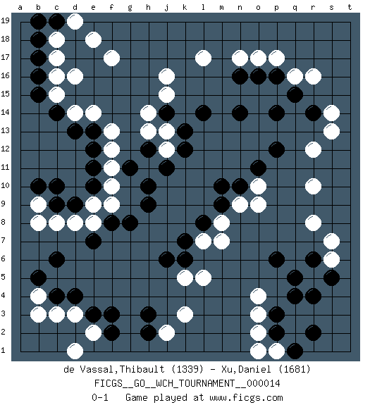 Last move : 0-1 2016 August 9 22:52:34 [Event "FICGS__GO__WCH_TOURNAMENT__000014"] [Site "FICGS"] [Date "2016.03.02"] [Round "1"] [Black "de Vassal,Thibault"] [White "Xu,Daniel"] [Result "0-1"] [Rating 1 "1339"] [Rating 2 "1681"] 1.d4 q16 2.q4 d16 3.c14 f17 4.b16 c17 5.c10 r10 6.r6 k3 7.h3 o3 8.p3 o4 9.r14 o17 10.p14 r12 11.n14 r8 12.c6 d3 13.e3 c3 14.c4 e2 15.f3 b4 16.b5 b3 17.j6 e14 18.e13 f13 19.e12 f12 20.l14 f11 21.e11 f10 22.f8 l17 23.j14 j16 24.q15 r16 25.o16 n17 26.p16 p17 27.p12 k5 28.k6 l5 29.h9 r5 30.q5 s6 31.s5 s7 32.r4 e9 33.h12 o9 34.n10 n9 35.m10 o2 36.p2 e8 37.e7 c8 38.m9 m8 39.l8 m7 40.e10 f9 41.g8 d14 42.d13 c15 43.b15 h11 44.j11 j12 45.h10 h13 46.g11 j13 47.k12 h14 48.k13 j15 49.d9 d8 50.f2 d1 51.b18 c18 52.p6 j2 53.h2 o10 54.o11 l7 55.k7 s13 56.c9 b9 57.b10 b8 58.n16 p1 59.q1 o1 60.r2 s14 61.b17 c16 62.c19 d19 63.b19 e18 0-1 Here are the names of the openings (joseki) played in the four corners : Corner d16 : d16 c14 Hoshi (Hwajeom, Seongjeom, Xingwei`) 4-4 Point. The star or hoshi (4-4) point, emphasizing influence at the potential expense of territory. Ikken Kakari (Hankan Keolch'im, Yi Gua`jiao~, 1-Space Low Approach). Black 2 is the standard approach move to the 4-4. Corner q16 : q16 r14 Hoshi (Hwajeom, Seongjeom, Xingwei`) 4-4 Point. The star or hoshi (4-4) point, emphasizing influence at the potential expense of territory. Ikken Kakari (Hankan Keolch'im, Yi Gua`jiao~, 1-Space Low Approach). Black 2 is the standard approach move to the 4-4. Player White won this Go (weiqi, baduk) game. Follow this game move after move (download)Ikken tobi is never wrong. (Anonymous) Establishing goals is all right if you don't let them deprive you of interesting detours. (Doug Larson)