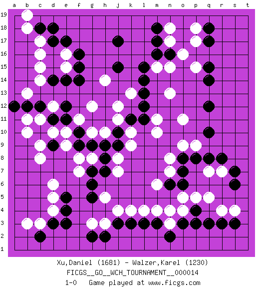 Last move : 1-0 2016 April 20 16:7:30 [Event "FICGS__GO__WCH_TOURNAMENT__000014"] [Site "FICGS"] [Date "2016.03.02"] [Round "1"] [Black "Xu,Daniel"] [White "Walzer,Karel"] [Result "1-0"] [Rating 1 "1681"] [Rating 2 "1230"] 1.q17 d4 2.q3 c16 3.e17 e16 4.f16 e15 5.d17 c17 6.f15 d12 7.j17 q5 8.q8 r7 9.r8 r4 10.q12 k4 11.m3 c8 12.d3 c3 13.e3 g3 14.e4 d5 15.c2 b3 16.g2 h3 17.h2 m4 18.l3 l4 19.j3 j4 20.k3 k10 21.e5 d6 22.g5 h5 23.g6 j7 24.q15 o16 25.m16 m15 26.l15 n15 27.l14 n13 28.l12 o11 29.q10 m11 30.l11 m10 31.f14 g12 32.d14 c15 33.e14 c14 34.c10 d10 35.d9 c9 36.d11 e10 37.e11 c11 38.c12 f11 39.e12 b11 40.b12 b10 41.c18 b18 42.d18 b13 43.a12 b19 44.r3 o4 45.p4 p5 46.o3 n3 47.n2 n4 48.p3 h14 49.j15 k13 50.l13 f7 51.g7 g8 52.h8 f8 53.h7 j8 54.o8 n8 55.o7 n7 56.o6 o5 57.n6 m6 58.h9 h10 59.j9 k9 60.n16 p15 61.q14 n17 62.m17 n18 63.m18 p17 64.q18 p18 65.s3 s4 66.s7 q7 67.s6 p9 68.p8 o9 69.g9 g10 70.f9 e9 71.j10 j11 72.k11 j12 73.f10 1-0 Here are the names of the openings (joseki) played in the four corners : Corner d16 : c16 e17 Komoku (Somok, Xiao~mu`) 3-4 Point. The komoku (3-4) point is the traditional corner enclosure move.. Ikken Kakari (Hankan Keolch'im, Yi Gua`jiao~, 1-Space Low Pincer). The small knight move is the basic approach move to the 3-4 point stone. It has been continually used for over four centuries. There are limitless variations, with new moves constantly being discovered. Black 2 opens the door to a treaure store of joseki. Corner q4 : q3 q5 Komoku (Somok, Xiao~mu`) 3-4 Point. The komoku (3-4) point is the traditional corner enclosure move.. Ikken Takagakari (Hankan Nop'dakeolch'im, Yi Gaogua`jiao~, 1-Space High Approach). The 5-4 approach move has become more popular in modern times, as modern Go emphasizes speed and influence. Player Black won this Go (weiqi, baduk) game. Follow this game move after move (download)Win the early ko to win the game. (Anonymous) Coffee just isn't my cup of tea. (Unknown)