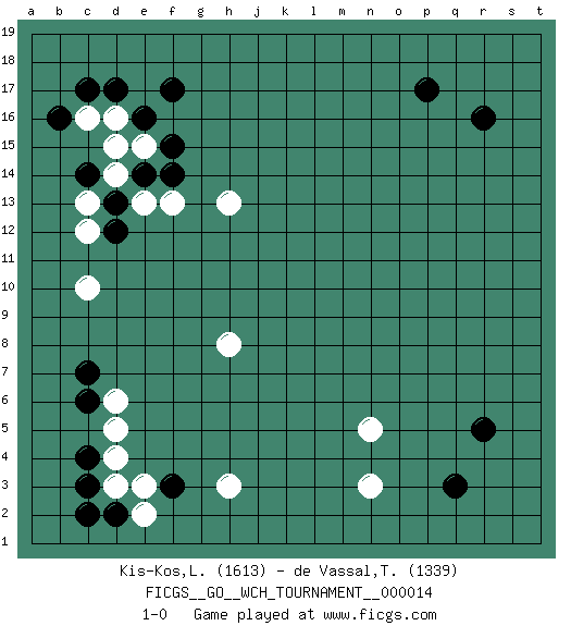 Last move : 1-0 2016 March 27 19:39:28 [Event "FICGS__GO__WCH_TOURNAMENT__000014"] [Site "FICGS"] [Date "2016.03.02"] [Round "1"] [Black "Kis-Kos,Laszlo"] [White "de Vassal,Thibault"] [Result "1-0"] [Rating 1 "1613"] [Rating 2 "1339"] 1.r16 d16 2.q3 d4 3.p17 c10 4.r5 n3 5.f3 h3 6.c3 d3 7.c4 d5 8.d2 e2 9.c2 e3 10.c6 n5 11.f17 d6 12.c7 h8 13.c14 e15 14.c17 c16 15.d17 f13 16.e16 d15 17.f15 h13 18.e14 d14 19.f14 e13 20.d13 c13 21.d12 c12 22.b16 1-0 Here are the names of the openings (joseki) played in the four corners : Corner d4 : d4 f3 Hoshi (Hwajeom, Seongjeom, Xingwei`) 4-4 Point. The star or hoshi (4-4) point, emphasizing influence at the potential expense of territory. Ikken Kakari (Hankan Keolch'im, Yi Gua`jiao~, 1-Space Low Approach). Black 2 is the standard approach move to the 4-4. Corner d16 : d16 f17 Hoshi (Hwajeom, Seongjeom, Xingwei`) 4-4 Point. The star or hoshi (4-4) point, emphasizing influence at the potential expense of territory. Ikken Kakari (Hankan Keolch'im, Yi Gua`jiao~, 1-Space Low Approach). Black 2 is the standard approach move to the 4-4. Player Black won this Go (weiqi, baduk) game. Follow this game move after move (download)With only one group, you will win. (Anonymous) Tree pose grows confidence. It roots me to this world. (Terri Guillemets)