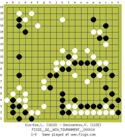 Last move : 1-0 2016 July 8 9:38:16 [Event "FICGS__GO__WCH_TOURNAMENT__000014"] [Site "FICGS"] [Date "2016.03.02"] [Round "1"] [Black "Kis-Kos,Laszlo"] [White "Denisenkov,Valentin"] [Result "1-0"] [Rating 1 "1613"] [Rating 2 "1132"] 1.r16 d4 2.q3 d17 3.p17 r10 4.r6 r13 5.d15 f16 6.c17 c18 7.c16 e18 8.c11 k17 9.k3 g3 10.c8 c6 11.c3 d3 12.b4 b5 13.d2 e2 14.b2 d1 15.c1 c2 16.c5 d5 17.d2 c4 18.e1 a4 19.b3 f2 20.k5 r3 21.r4 s4 22.s3 r2 23.s5 q2 24.p3 p2 25.o3 s2 26.t4 o2 27.n3 n2 28.t2 m3 29.m4 l3 30.k4 q8 31.s8 o7 32.p10 o12 33.n10 m12 34.r9 q10 35.q9 p11 36.o10 l10 37.p8 m8 38.l11 m11 39.l9 k10 40.k9 k12 41.m10 j9 42.j8 j10 43.h8 g7 44.h6 g6 45.l2 m2 46.k2 p15 47.q14 q15 48.r14 1-0 Here are the names of the openings (joseki) played in the four corners : Corner d16 : d17 d15 Komoku (Somok, Xiao~mu`) 3-4 Point. The komoku (3-4) point is the traditional corner enclosure move.. Ikken Takagakari (Hankan Nop'dakeolch'im, Yi Gaogua`jiao~, 1-Space High Approach). The 5-4 approach move has become more popular in modern times, as modern Go emphasizes speed and influence. Player Black won this Go (weiqi, baduk) game. Follow this game move after move (download)To emphasize the lack of determination in his moves, one speaks of chance. (Pierre Audouard) I find your interest interesting. (Gregory House, House M.D.)