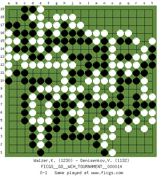 Last move : 0-1 2016 September 21 17:22:42 [Event "FICGS__GO__WCH_TOURNAMENT__000014"] [Site "FICGS"] [Date "2016.03.02"] [Round "1"] [Black "Walzer,Karel"] [White "Denisenkov,Valentin"] [Result "0-1"] [Rating 1 "1230"] [Rating 2 "1132"] 1.d3 q16 2.c5 q4 3.d16 k4 4.q10 f17 5.f16 g16 6.f15 e17 7.d17 d18 8.c18 e18 9.k16 j17 10.j16 k17 11.g15 l16 12.h16 g17 13.d10 r13 14.r6 r5 15.q6 o3 16.h3 l14 17.j10 h5 18.m3 m4 19.k3 n3 20.l3 m5 21.p13 o15 22.l15 m15 23.k15 m16 24.h17 h18 25.m14 k14 26.h14 m13 27.n14 o13 28.n13 o14 29.n12 o12 30.q13 r12 31.p11 o11 32.q15 r15 33.p15 p16 34.n11 o10 35.p8 n10 36.m10 s10 37.r10 s9 38.r8 s8 39.o5 o6 40.o7 p5 41.n6 p6 42.p7 n5 43.m7 n8 44.n7 m9 45.l8 m11 46.m12 l10 47.l12 k9 48.k8 j8 49.j7 j9 50.h7 g9 51.j5 k5 52.j4 h11 53.k11 h10 54.j11 j14 55.h15 h13 56.j13 j12 57.k13 f12 58.d13 d12 59.e13 e12 60.c10 c13 61.c14 c12 62.f8 k6 63.b14 g8 64.g7 f9 65.e8 e9 66.d9 q11 67.r11 q12 68.s11 s6 69.s5 s4 70.s7 t5 71.t7 f13 72.f14 d15 73.c15 e16 74.d14 e15 75.c16 j18 76.g13 h12 77.l13 g12 78.h8 h9 79.b11 b13 80.p10 p12 81.t14 s14 82.t13 t15 83.s12 s13 84.t12 e14 85.d19 e19 86.c19 g18 87.e10 k7 88.f10 j6 89.h6 f7 90.g6 h4 91.j3 f6 92.g5 f5 93.g4 d8 94.c8 d7 95.c7 d6 96.c6 e3 97.d4 e4 98.f2 e2 99.f3 d5 100.d2 m8 101.l7 o9 102.q5 o4 103.l11 m10 104.n15 n16 105.m2 n2 106.e1 g14 107.j15 t6 108.f4 e5 109.p9 t8 110.r7 a14 111.a15 a13 112.c11 a16 113.b17 b15 114.a17 a15 115.b16 a11 116.a10 a12 117.n1 o1 0-1 Here are the names of the openings (joseki) played in the four corners : Corner d16 : d16 f17 Hoshi (Hwajeom, Seongjeom, Xingwei`) 4-4 Point. The star or hoshi (4-4) point, emphasizing influence at the potential expense of territory. Ikken Kakari (Hankan Keolch'im, Yi Gua`jiao~, 1-Space Low Approach). White 2 is the standard approach move to the 4-4. Corner q4 : q4 r6 Hoshi (Hwajeom, Seongjeom, Xingwei`) 4-4 Point. The star or hoshi (4-4) point, emphasizing influence at the potential expense of territory. Ikken Kakari (Hankan Keolch'im, Yi Gua`jiao~, 1-Space Low Approach). Black 2 is the standard approach move to the 4-4. Player White won this Go (weiqi, baduk) game. Follow this game move after move (download)Keep away from thickness. (Anonymous) A person who never made a mistake never tried anything new. (Albert Einstein)