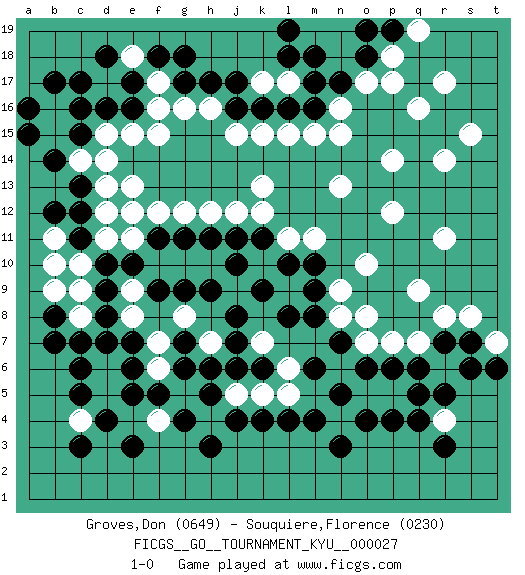 Last move : 1-0 2007 May 11 23:4:5 [Event "FICGS__GO__TOURNAMENT_KYU__000027"] [Site "FICGS"] [Date "2007.03.22"] [Round "1"] [Black "Groves,Don"] [White "Souquiere,Florence"] [Result "1-0"] [Rating 1 "0649"] [Rating 2 "0230"] 1.q4 q16 2.d16 c4 3.e3 c10 4.c6 d6 5.d7 q9 6.c13 e13 7.g17 f15 8.k16 p7 9.r7 n15 10.n17 j15 11.n3 p5 12.p4 n4 13.o4 o5 14.m4 p17 15.n5 r14 16.h3 c8 17.c7 r6 18.q6 r4 19.r5 q7 20.q5 r11 21.e6 o17 22.o6 r8 23.s7 n18 24.m17 l17 25.l16 k17 26.j16 d5 27.c5 l15 28.m16 n6 29.p6 f17 30.m18 m15 31.j17 s8 32.s6 c14 33.c15 d17 34.c17 e18 35.e16 b16 36.c16 d15 37.e17 f16 38.d18 k15 39.g18 g16 40.f18 e15 41.m6 r17 42.e5 b15 43.b14 d14 44.b12 b10 45.a15 o7 46.n7 n8 47.m8 o8 48.m10 d11 49.a16 o10 50.d4 n13 51.d9 e9 52.d8 l9 53.m9 f7 54.g6 g5 55.h5 m11 56.l10 k10 57.k9 j9 58.l8 l11 59.j8 g10 60.j10 n16 61.h9 h16 62.h17 t7 63.t6 g8 64.g9 h10 65.k11 k12 66.h11 h12 67.g11 m19 68.l18 f10 69.f11 f12 70.e10 e11 71.f9 j12 72.g7 h7 73.h6 p12 74.c11 b11 75.c12 p14 76.l19 c9 77.d10 k13 78.c3 s15 79.r3 d12 80.b8 d13 81.b17 k5 82.j7 f6 83.g4 k7 84.k6 l6 85.j6 j5 86.j4 b9 87.b7 e8 88.e7 f4 89.f5 e12 90.k4 n19 91.o18 p18 92.o19 g12 93.j11 l5 94.l4 n9 95.p19 q19 96.pass 1-0 Here are the names of the openings (joseki) played in the four corners : Corner d4 : c4 e3 Komoku (Somok, Xiao~mu`) 3-4 Point. The komoku (3-4) point is the traditional corner enclosure move.. Ikken Kakari (Hankan Keolch'im, Yi Gua`jiao~, 1-Space Low Pincer). The small knight move is the basic approach move to the 3-4 point stone. It has been continually used for over four centuries. There are limitless variations, with new moves constantly being discovered. Black 2 opens the door to a treaure store of joseki. Corner q4 : q4 q9 Hoshi (Hwajeom, Seongjeom, Xingwei`) 4-4 Point. The star or hoshi (4-4) point, emphasizing influence at the potential expense of territory. Player Black won this Go (weiqi, baduk) game. Follow this game move after move (download)Don't defend - extend ! (Bill Taylor) A good programmer is someone who always looks both ways before crossing a one-way street. (Doug Linder)