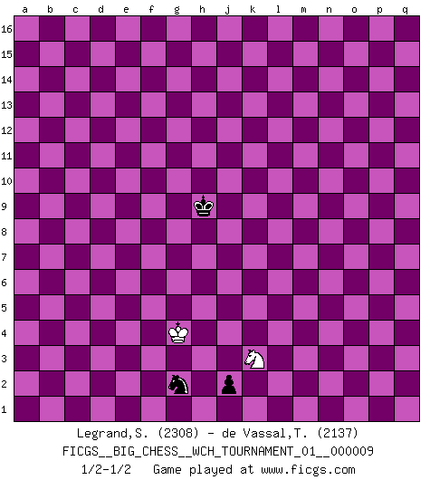 Last move : 1/2-1/2 2018 April 20 19:51:41 [Event "FICGS__BIG_CHESS__WCH_TOURNAMENT_01__000009"] [Site "FICGS"] [Date "2016.03.02"] [Round "1"] [White "Legrand,Stephane"] [Black "de Vassal,Thibault"] [Result "1/2-1/2"] [WhiteElo "2308"] [BlackElo "2137"] 1.m2-m4 j15-k13 2.p1-o3 h15-g13 3.b1-c3 e15-e13 4.e2-e4 m15-m13 5.j2-k4 p16-o14 6.f1-b5 h16-o10 7.h2-g4 b16-c14 8.l1-p5 g16-j15 9.d2-d4 l16-p12 10.k1-h2 f16-b12 11.c1-l9 k16-h15 12.n2-n3 d15-d14 13.o1-f9 n15-n14 14.h1-l4 m16-m14 15.m1-m3 m14-l14 16.l4-k3 c16-l8 17.m3-l3 e16-e14 18.e1-e3 e14-f14 19.e3-f3 o16-f8 20.g1-e2 o10-h10 21.l9-n7 l14-l12 22.q1-m1 l12-k12 23.k3-j4 k12-k9 24.p5-o4 h10-h13 25.f9-g8 k9-g9 26.b5-c4 h13-b7 27.n7-l5 g9-g12 28.c4-b3 g12-j12 29.j4-k3 f14-f11 30.j1-k1 q16-m16 31.f3-f7 b7-b8 32.f7-j7 j12-k12 33.k3-d9 b8-b11 34.d9-c8 l8-g12 35.c8-c6 g12-h11 36.c6-d5 h15-f14 37.a1-d1 q15-q13 38.d1-d3 o14-n12 39.a2-a4 p15-p13 40.d3-f3 o15-o13 41.l5-m6 j16-h15 42.m6-h10 k12-d12 43.d5-a5 f8-e9 44.f3-f11 g13-f11 45.a5-a8 j15-g14 46.h10-m6 b11-d9 47.j7-p7 f11-g13 48.l3-l9 d9-g12 49.a8-c10 g12-k12 50.p7-q7 k12-m10 51.c10-m10 n12-m10 52.m6-l5 d12-j12 53.l9-n9 m16-m14 54.o4-k8 m10-n12 55.g8-h7 m14-k14 56.k8-n11 l15-l13 57.h7-l10 j12-h12 58.q7-h7 h11-l8 59.h7-h12 k13-h12 60.o3-n5 a16-l16 61.l10-f5 k14-k10 62.n3-n4 l16-l14 63.m1-m3 l14-k14 64.h2-j4 c14-d12 65.e2-g3 f14-h13 66.k1-j2 l8-j10 67.f5-e6 h13-k12 68.n9-n7 k10-n10 69.n7-n10 p12-n10 70.m3-p3 n10-l12 71.e6-d5 k12-l10 72.n11-j7 c15-c13 73.j4-h6 j10-d5 74.b3-d5 l12-d5 75.c3-d5 k14-k11 76.h6-g8 e9-f8 77.g4-f6 k11-j11 78.k4-l6 g13-h11 79.f6-h7 f8-g7 80.g3-f5 g7-n13 81.p3-p10 l10-j9 82.g8-j9 h11-j9 83.h7-k8 h12-k11 84.b2-b3 f15-f14 85.g2-g4 a15-a13 86.j7-g5 q13-q12 87.g5-f6 n13-o12 88.p10-a10 b15-b13 89.c2-c4 a13-a12 90.b3-b4 g14-h12 91.b4-b5 p13-p12 92.c4-c5 o12-l15 93.d5-e7 j11-a11 94.a10-a11 b12-a11 95.e7-g8 a11-f6 96.g8-f6 n12-l11 97.d4-d5 h12-j10 98.d5-d6 b13-b12 99.h3-h4 a12-a11 100.g4-g5 b12-b11 101.j2-h3 d14-d13 102.j3-j4 c13-c12 103.h4-h5 d12-e10 104.h3-g4 l15-g11 105.k8-h9 g11-h12 106.f5-h6 d13-d12 107.f2-f4 c12-c11 108.e4-e5 a11-a10 109.j4-j5 p12-p11 110.k2-k4 o13-o12 111.k4-k5 n14-n13 112.k5-k6 q12-q11 113.j5-j6 q11-q10 114.k6-k7 q10-q9 115.h6-j8 n13-n12 116.h5-h6 p11-p10 117.l6-j7 o12-o11 118.k7-k8 j9-g10 119.j7-g6 o11-o10 120.j6-j7 n12-n11 121.n5-m7 p10-p9 122.g4-h5 q9-q8 123.l2-l4 m13-m12 124.h5-j6 l11-k9 125.m4-m5 h15-g14 126.o2-o4 g14-f13 127.n4-n5 f13-e12 128.f6-e8 e12-f11 129.o4-o5 b11-b10 130.o5-o6 a10-a9 131.p2-p4 g10-j11 132.j8-g7 j11-h9 133.g7-h9 k11-h10 134.h6-h7 e10-d8 135.c5-c6 h10-f9 136.g6-f8 d8-e10 137.g5-g6 e10-f8 138.h9-f8 k9-h10 139.f4-f5 h10-g12 140.k8-k9 j10-g11 141.f5-f6 g12-f10 142.e8-g9 f11-e12 143.j7-j8 f10-d11 144.f8-g10 h12-j13 145.m7-l9 j13-n9 146.l9-m11 n9-l7 147.l5-m6 l7-m6 148.n5-m6 k15-k14 149.m11-o12 g11-h13 150.j6-j7 b10-b9 151.j8-j9 b9-b8 152.j9-j10 a9-a8 153.k9-k10 d11-f10 154.j7-j8 f9-d8 155.j10-j11 d8-e6 156.o12-m13 e6-c5 157.a4-a5 c5-b3 158.a5-a6 b3-d4 159.j11-j12 h13-g11 160.m13-k14 d4-b5 161.g9-f7 c11-c10 162.g10-e9 d12-d11 163.e9-d7 f10-d9 164.k10-k11 d11-d10 165.k14-m15 b5-d4 166.m15-l13 j14-j13 167.h7-h8 d4-c6 168.h8-h9 c10-c9 169.g6-g7 a8-a7 170.d7-c5 d9-f10 171.l13-j14 h14-h13 172.j12-h13 g11-h13 173.j8-h8 f10-h11 174.g7-g8 h11-k12 175.j14-l15 e12-f12 176.e5-e6 e13-e12 177.f7-g9 f12-g12 178.l15-k13 k12-l10 179.g9-j8 h13-k12 180.j8-h10 g12-f12 181.h10-j12 c6-e5 182.l4-l5 e5-g4 183.f6-f7 g4-h6 184.h8-j7 h6-j4 185.l5-l6 j4-l3 186.j12-k10 l3-m5 187.p4-p5 m5-l3 188.k10-l8 l3-n4 189.q2-q4 q8-q7 190.m6-m7 q7-q6 191.m7-m8 l10-m8 192.k13-m12 q6-p5 193.q4-p5 m8-l6 194.j7-k6 l6-n5 195.l8-k10 n4-p5 196.k10-l12 p5-n4 197.l12-n11 f12-g12 198.n11-m9 o10-o9 199.m9-n7 o9-o8 200.n7-p8 n5-m7 201.k6-l7 m7-o6 202.p8-o6 n4-o6 203.m12-n10 o6-q7 204.l7-m7 k12-l10 205.m7-n8 l10-k8 206.n8-o7 k8-m7 207.o7-p6 p9-p8 208.n10-m8 g12-h12 209.m8-k9 f14-f13 210.e6-e7 f13-f12 211.e7-e8 e12-e11 212.f7-f8 g15-g13 213.d6-d7 m7-l9 214.k9-h10 g13-g12 215.d7-d8 c9-c8 216.h10-f9 b8-b7 217.a6-b7 c8-b7 218.c5-b7 l9-k11 219.e8-e9 d10-e9 220.f8-e9 e11-e10 221.f9-e7 h12-j11 222.g8-g9 f12-f11 223.e7-c6 a7-a6 224.c6-b8 j11-k10 225.g9-g10 k10-j9 226.g10-f11 g12-f11 227.b8-a6 j9-h9 228.a6-c7 j13-j12 229.d8-d9 e10-d9 230.c7-d9 k11-h10 231.b7-d8 h9-g9 232.e9-e10 f11-f10 233.e10-e11 j12-j11 234.d8-f7 g9-f9 235.f7-h8 f9-e10 236.d9-f8 e10-f11 237.f8-g10 h10-g12 238.g10-j9 g12-e11 239.j9-l10 e11-g10 240.h8-k9 q7-p9 241.l10-n9 p8-p7 242.k9-m8 f10-f9 243.n9-m7 f11-f10 244.m7-o8 p9-n8 245.p6-o7 n8-l9 246.o7-p7 f10-g9 247.p7-o6 g9-g8 248.o6-n5 g10-h8 249.n5-m5 f9-f8 250.m5-l4 g8-g7 251.o8-m9 f8-f7 252.l4-k4 g7-g6 253.k4-j4 f7-f6 254.m9-k8 f6-f5 255.j4-h4 l9-k7 256.m8-l6 g6-h6 257.h4-g3 h8-g6 258.l6-k4 k7-j5 259.g3-f3 j5-h7 260.k8-j10 h7-g5 261.f3-f2 h6-j5 262.k4-j2 g5-e4 263.f2-e3 j5-h5 264.j10-g9 e4-g5 265.g9-e8 f5-f4 266.e3-f2 j11-j10 267.e8-f6 h5-j4 268.f6-g8 g6-h4 269.j2-g3 j4-h3 270.g3-e2 g5-e4 271.f2-e1 h4-g2 272.e1-d1 h3-g4 273.e2-f4 g2-f4 274.d1-e1 g4-g5 275.e1-f1 g5-g6 276.g8-j9 g6-g7 277.f1-g1 g7-h8 278.j9-k11 h8-h9 279.g1-h2 e4-f6 280.k11-l9 j10-j9 281.l9-k7 j9-j8 282.k7-h6 j8-j7 283.h6-k5 j7-j6 284.k5-h4 j6-j5 285.h4-k3 f6-g4 286.h2-g3 j5-j4 287.k3-l5 j4-j3 288.g3-g4 j3-j2 289.l5-k3 f4-g2 1/2-1/2 Follow this game move after move (download)Examine moves that smite! A good eye for smites is far more important than a knowledge of strategical principles. (Purdy) Ja, ich habe einmal eine Blitzpartie gespielt, es war in einem Zug, 1929. --im Interview 1989 (Mikhail Moiseyevich Botvinik) Si el Ajedrez es una ciencia, es la mas inexacta. Si el Ajedrez es un arte, es demasiado inexacto para ser visto como tal. Si el Ajedrez es un deporte, es demasiado esotérico. Si el Ajedrez es un juego, es demasiado exigente para ser solo un juego. Si el Ajedrez es una aventura, es una muy demandante. Si el Ajedrez es una pasión, es una muy gratificante. Si el Ajedrez es la vida, es una muy triste. (Anónimo) Les échecs, c'est l'imagination. (David Bronstein) Memory is a complicated thing, a relat