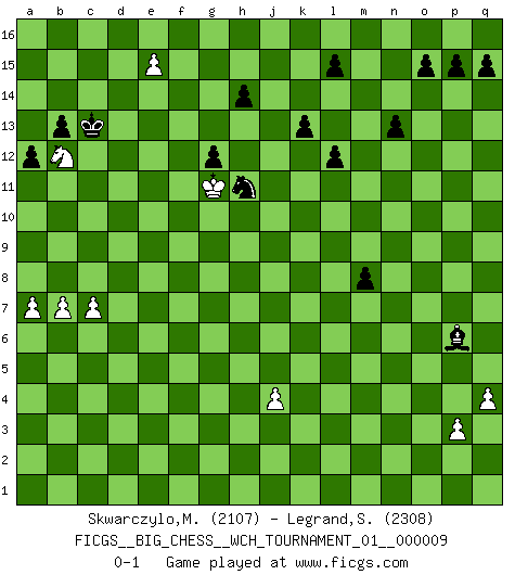 Last move : 0-1 2016 November 4 23:6:41 [Event "FICGS__BIG_CHESS__WCH_TOURNAMENT_01__000009"] [Site "FICGS"] [Date "2016.03.02"] [Round "1"] [White "Skwarczylo,Marek"] [Black "Legrand,Stephane"] [Result "0-1"] [WhiteElo "2107"] [BlackElo "2308"] 1.j2-k4 h15-g13 2.h1-o7 m15-m13 3.o7-l7 j15-k13 4.l7-c15 e15-e13 5.c15-c10 k16-h15 6.p1-o3 l16-o13 7.b1-c3 b16-c14 8.e2-e4 d15-d13 9.f1-b5 c16-k9 10.d2-d3 f16-b12 11.m2-m4 n15-n14 12.l1-p5 e13-e12 13.n2-n3 g16-f14 14.c1-l9 p16-o14 15.o1-f9 o16-f8 16.g1-j2 a16-c16 17.c10-j4 j16-k16 18.h2-g4 c14-e13 19.e1-e3 e13-f11 20.m1-m3 f11-h10 21.f9-e8 h10-j8 22.l9-m8 j8-g7 23.e8-f7 h16-k14 24.k1-h2 k14-b6 25.f7-c4 m16-m14 26.a1-e1 k9-h7 27.m3-l3 c16-c11 28.j4-p10 o13-p14 29.b5-k13 j14-k13 30.m8-h12 f8-e9 31.c3-d5 b6-d8 32.h12-e9 d8-e9 33.g4-f6 h7-m11 34.l3-l9 e9-j13 35.e3-g3 g7-j8 36.l9-b9 a15-a13 37.q1-m1 e16-c16 38.h2-j4 c11-c10 39.p10-p9 m14-l14 40.q2-q4 l14-l10 41.m1-m3 h15-k14 42.m3-l3 q16-m16 43.l3-l10 m11-l10 44.c4-b3 m13-m12 45.o3-n5 k14-j12 46.k4-h5 j13-l11 47.j2-k4 l11-m10 48.e1-e3 l10-k11 49.j1-h2 c10-b10 50.b9-b10 m10-b10 51.p9-p8 k11-l12 52.p8-n6 c16-c14 53.h5-k6 j8-k6 54.n6-k6 d13-d12 55.k6-m6 b12-d14 56.m6-n7 c14-c9 57.n7-a7 b15-b14 58.g3-g7 b10-a9 59.a7-a9 c9-a9 60.g7-b7 f14-d13 61.e3-g3 k16-j15 62.g3-g7 m16-c16 63.b7-c7 c16-c7 64.g7-c7 d13-c11 65.j4-g3 d14-c13 66.p2-p3 c11-d9 67.c7-m7 n14-n13 68.m7-m9 a9-b9 69.d5-e7 d9-c11 70.m9-b9 c11-b9 71.b3-l12 k13-l12 72.e7-d9 e12-e11 73.f6-d7 a13-a12 74.d9-b10 b14-b13 75.b10-d11 c13-d14 76.g3-f5 g13-f11 77.d7-e9 f11-e9 78.d11-e9 j12-h10 79.p5-d16 b9-d10 80.d16-j11 h10-f11 81.e9-f11 d10-f11 82.f5-e7 d14-j9 83.b2-b3 j9-e5 84.h2-j2 e5-d6 85.j11-f8 f11-d10 86.e7-g6 d6-f8 87.g6-f8 o14-m13 88.j3-j4 m13-k12 89.j2-j3 j15-j14 90.j3-h4 k12-j10 91.h4-g5 j14-h13 92.g5-h6 j10-g9 93.f8-g10 k15-k13 94.h6-g7 g9-e10 95.k4-h5 e10-d8 96.h5-f4 d8-c6 97.c2-c3 g15-g13 98.g10-e9 h13-g12 99.e9-c10 d10-f11 100.g7-f7 g12-f12 101.f7-e6 d12-d11 102.e6-d6 c6-a7 103.c10-b12 f11-e9 104.c3-c4 p14-j8 105.b12-a10 a7-b9 106.a10-c9 j8-g10 107.c9-b7 f12-f11 108.n5-m3 d11-d10 109.m3-k4 e9-c8 110.d6-e5 e11-e10 111.d3-d4 e10-e9 112.b7-d6 c8-e7 113.d4-d5 e7-g8 114.f4-h5 f15-f13 115.c4-c5 f13-f12 116.c5-c6 b9-c7 117.b3-b4 d10-d9 118.b4-b5 e9-e8 119.b5-b6 c7-a8 120.d6-c4 g8-e9 121.a2-a4 f11-e10 122.a4-a5 f12-f11 123.h5-g7 f11-f10 124.g7-e6 f10-f9 125.e6-f8 e10-f10 126.f8-d9 f10-g9 127.d9-c11 g10-c14 128.c11-e10 g9-f10 129.e10-d8 g13-g12 130.e5-f6 f9-f8 131.d8-e6 f10-g9 132.f2-f4 e8-e7 133.f6-g5 g9-g8 134.g2-g4 a8-c9 135.e6-d8 c14-e12 136.f4-f5 e12-d11 137.f5-f6 e7-f6 138.g5-f6 c9-e8 139.f6-e5 e9-c8 140.d5-d6 e8-g9 141.b6-b7 c8-e9 142.a5-a6 g9-h7 143.c4-e3 e9-f7 144.d8-f7 g8-f7 145.a6-a7 h7-g5 146.e3-f5 f7-g6 147.d6-d7 g5-f7 148.e5-f4 g6-f6 149.f5-d4 f6-e7 150.e4-e5 f7-h8 151.f4-e4 d11-g8 152.k4-h5 h8-k7 153.d4-f5 e7-d8 154.h5-f6 g8-k11 155.e4-d4 k7-m6 156.d4-c5 m6-n4 157.c5-d6 n4-o2 158.c6-c7 d8-e9 159.d7-d8 e9-d9 160.k2-k3 k11-j10 161.f6-h7 f8-f7 162.f5-e7 d9-c10 163.d8-d9 c10-d11 164.h7-g9 j10-o5 165.g9-f7 o5-l2 166.e7-c8 o2-p4 167.e5-e6 p4-n3 168.e6-e7 n3-o5 169.e7-e8 o5-m4 170.e8-e9 m4-k3 171.e9-e10 d11-d12 172.d9-d10 l2-m3 173.e10-e11 d12-d13 174.f7-h8 k3-j5 175.c8-e9 j5-h3 176.h8-g10 h3-j5 177.d10-d11 j5-g4 178.g10-f12 d13-d14 179.d11-d12 m3-n4 180.e9-d11 g4-h6 181.d6-e7 h6-g8 182.e7-f8 g8-j9 183.f8-e9 m12-m11 184.e9-f10 m11-m10 185.d11-c13 m10-m9 186.f10-g11 m9-m8 187.e11-e12 j9-h11 188.e12-e13 d14-c14 189.f12-d11 c14-d13 190.d11-b12 d13-d12 191.e13-e14 d12-c13 192.e14-e15 n4-p6 0-1 Follow this game move after move (download)There is no remorse like the remorse of Chess. (H. G. Wells) Ich verstehe Aljechins Kombinationen ganz gut; aber woher er diese Angriffschancen bekommt und wie er die Eröffnung behandelt das ist für mich ein Buch mit sieben Siegeln. (Rudolf Spielmann) Me gusta decir que Bobby Fischer fue el mejor jugador que jamás haya existido. Pero lo que hizo de Fischer un genio, fue su habilidad de mezclar una frescura y pragmatismo Americano con ideas Rusas acerca de la estrategia. (Bruce Pandolfini) À la honte des hommes, on sait que les lois du jeu sont les seules qui soient partout justes, claires, inviolables et exécutées. Pourquoi l'Indien qui a donné les règles du jeu d'échecs est-il obéi de bon gré dans toute la terre, et que les décrétales des papes, par exemple, sont aujourd'hui un objet d'horreur et de mépris ? C'est que l'inventeur des échecs combina tout avec justesse pour la satisfaction des joueurs, et que les papes, dans leurs décrétales, n'eurent en vue que leur seul avantage. L'Indien voulut exercer également l'esprit des hommes et leur donner du plaisir; les papes ont voulu abrutir l'esprit des hommes. Voltaire (Dictionnaire philosophique / Garnier 1967) God is an atheist. (Unknown)