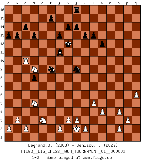 Last move : 1-0 2017 April 9 23:10:14 [Event "FICGS__BIG_CHESS__WCH_TOURNAMENT_01__000009"] [Site "FICGS"] [Date "2016.03.02"] [Round "1"] [White "Legrand,Stephane"] [Black "Denisov,Timofey"] [Result "1-0"] [WhiteElo "2308"] [BlackElo "2027"] 1.m2-m4 j15-h13 2.p1-o3 n15-n13 3.b1-c3 o16-g9 4.j2-k4 h16-o10 5.h2-g4 d15-d13 6.e2-e4 c16-k9 7.h1-q9 o10-k10 8.l1-p5 k10-j10 9.b2-b3 e15-e13 10.f1-c4 j10-j8 11.c4-d3 j8-h9 12.m1-m3 g16-j15 13.m3-n3 g9-k12 14.e4-e5 k9-j8 15.q9-h9 j8-h9 16.n3-n13 p16-o14 17.n2-n3 q16-n16 18.n13-p13 p15-p14 19.p13-p9 n16-n9 20.p9-n9 k12-n9 21.d3-c4 h9-j8 22.o1-g8 l15-l14 23.c1-a3 o14-m13 24.g8-h9 j8-h9 25.c4-h9 e13-e12 26.e1-e4 f16-d14 27.a1-e1 n9-m10 28.g1-f3 m16-n16 29.e4-d4 n16-n9 30.h9-k7 n9-k9 31.k7-h5 c15-c14 32.d4-d9 k9-d9 33.h5-d9 e12-e11 34.e5-e6 e11-e10 35.d9-c8 m13-k12 36.j1-j2 e10-e9 37.e1-e5 m15-m13 38.e5-b5 b15-b14 39.b5-b10 m10-l11 40.b10-o10 l16-o13 41.c8-b7 d14-l7 42.o10-o7 l7-j9 43.b7-e4 o13-n14 44.k1-h2 m13-m12 45.f3-g5 n14-k11 46.o7-q7 q15-q13 47.g5-h7 j9-g11 48.e4-d5 k11-l12 49.q7-q10 k12-j10 50.e6-e7 e16-e10 51.h2-k3 h15-k14 52.p5-o4 b16-d15 53.h7-k8 h13-k12 54.k8-h9 g11-o4 55.n3-o4 k16-h15 56.q1-n1 e10-d10 57.g4-e3 a16-h16 58.k4-j6 j15-h13 59.o3-n5 j16-j15 60.n5-l6 k14-j12 61.l6-j7 d15-e13 62.j7-k9 l11-j9 63.p2-p3 j12-g11 64.h9-g11 j9-g11 65.j6-g7 g11-j9 66.g7-f9 d10-f10 67.e7-e8 e13-f11 68.k9-j11 h13-j11 69.a3-j11 k12-h13 70.j11-l13 k15-k14 71.l13-m14 h15-j13 72.m14-o12 f11-g9 73.o12-j7 j13-h11 74.k3-j5 f10-f12 75.j5-k7 j9-k10 76.l2-l4 k14-k13 77.d5-c6 k10-j11 78.k7-h8 j10-h8 79.j7-h8 l14-l13 80.h8-g7 h16-e16 81.q10-o10 f12-f10 82.o10-o14 l12-n14 83.c6-d5 g9-e8 84.d5-n14 o15-n14 85.n1-n14 j15-h15 86.n14-n15 h15-g14 87.n15-n8 e8-g7 88.f9-g7 f10-f2 89.o14-p14 e16-j16 90.p14-q14 f2-d2 91.q14-q13 d2-d9 92.c3-d5 g14-g13 93.q2-q4 g13-h12 94.q4-q5 j11-g9 95.l4-l5 a15-a13 96.q5-q6 g9-f8 97.g7-h9 f8-h10 98.n8-h8 d9-d8 99.h8-d8 e9-d8 100.q13-q8 h13-g11 101.h9-f8 h11-j9 102.f8-d9 g11-f9 103.q8-e8 g15-g13 104.e8-e10 h10-g11 105.e10-b10 b14-b13 106.b10-c10 1-0 This big chess game has been lost on time (started : 2016.03.02 15:44:59) Follow this game move after move (download)My God, Bobby Fischer plays so simply. (Alexei Suetin) Die FIDE ist dabei in die Hände der russischen Mafia zu fallen. (Larry Evans) Por esta medida (el intervalo entre Fischer y sus contemporaneos), yo le considero el mas grande campeón mundial. (Garry Kasparov) Les Echecs ne sont pas pour les âmes timides. Ils requièrent un homme entier, qui ne s'arrête pas aveuglément à ce qui a été déjà établi, mais qui tente individuellement de sonder les profondeurs du jeu. (W. Steinitz) Games, world of games... There's always an opponent, and there's always a victim. (Revolver, movie)