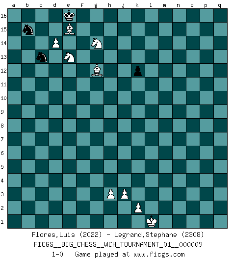 Last move : 1-0 2017 September 17 18:25:46 [Event "FICGS__BIG_CHESS__WCH_TOURNAMENT_01__000009"] [Site "FICGS"] [Date "2016.03.02"] [Round "1"] [White "Flores,Luis"] [Black "Legrand,Stephane"] [Result "1-0"] [WhiteElo "2022"] [BlackElo "2308"] 1.j2-k4 p16-o14 2.p1-o3 m15-m13 3.b1-c3 b16-c14 4.m2-m4 e15-e13 5.e2-e4 j15-k13 6.f1-b5 f16-b12 7.l1-p5 h16-o10 8.h2-g4 l16-p12 9.k1-h2 d15-d13 10.n2-n3 c16-f13 11.d2-d3 f13-e12 12.c1-l9 n15-n13 13.h1-n6 k16-l14 14.o1-f9 o16-f8 15.g1-j2 g16-j15 16.l9-m8 o10-l13 17.m1-m3 m13-m12 18.m3-l3 k13-l11 19.e1-e3 h15-g13 20.e3-f3 c14-d12 21.f9-g10 d12-f11 22.n6-d15 e16-e15 23.d15-b13 c15-c14 24.b13-h7 e15-e14 25.q1-m1 e14-f14 26.h7-m7 e12-f13 27.m7-m5 e13-e12 28.m5-j8 l13-k12 29.m8-j11 f8-j11 30.p5-j11 k12-j13 31.j11-f8 j13-b6 32.l3-l6 b6-b10 33.f8-c5 a15-a13 34.a2-a4 f13-l8 35.l6-l8 p12-l8 36.j8-l8 a16-d16 37.l8-p8 o14-n16 38.p8-l12 n16-m14 39.l12-p8 f11-h12 40.g10-e8 f14-f3 41.h2-f3 h12-f11 42.m1-m3 b10-b8 43.e4-e5 q15-q13 44.p8-p6 q16-q14 45.e8-g6 n13-n12 46.o3-n1 q14-p14 47.p6-k6 d13-d12 48.d3-d4 b8-n8 49.g6-j4 n8-q5 50.o2-o3 q5-q2 51.j1-h2 m14-k13 52.m3-l3 m16-m13 53.b5-c4 m13-o13 54.j4-f7 p14-o14 55.k6-p6 o14-p14 56.p6-d6 j16-h15 57.f7-o15 p14-p8 58.d6-b6 q2-p3 59.o3-o4 p8-q8 60.n1-o3 o13-o8 61.b2-b3 o8-l8 62.l3-l8 q8-l8 63.b6-n6 l8-l10 64.o15-q13 l10-q10 65.q13-k7 d16-q16 66.o3-p5 q10-q1 67.a1-q1 q16-q1 68.h2-g3 q1-n1 69.k7-o3 p3-o2 70.k4-m3 o2-l2 71.m3-n1 b12-n1 72.n6-k6 n1-m2 73.m4-m5 l2-k1 74.g3-h2 k1-n1 75.n3-n4 m2-o4 76.p5-n6 o4-n5 77.k6-k4 n1-o2 78.j2-l3 o2-j7 79.c3-b5 n5-o6 80.k4-h6 j7-k7 81.h2-j2 b15-b14 82.n6-l5 k7-l8 83.h6-o6 l8-l5 84.o6-l6 l5-f10 85.f3-h4 j15-h13 86.l6-b6 f10-l10 87.b6-g6 l10-l4 88.g6-k3 l4-l9 89.o3-p4 p15-p13 90.p4-o5 p13-p12 91.p2-p4 n12-n11 92.c4-d3 p12-p11 93.k3-k5 b14-b13 94.b5-d6 d12-d11 95.d6-f5 c14-c13 96.f5-h6 b13-b12 97.h6-j4 a13-a12 98.k5-p10 l9-n9 99.p10-m7 f11-d12 100.m7-c16 d12-e14 101.c16-l16 h13-j15 102.l16-e16 a12-a11 103.o5-f13 g15-g14 104.f13-o5 p11-p10 105.e16-p16 p10-p9 106.d3-c4 l11-m9 107.p16-h9 n9-m10 108.c4-d3 p9-p8 109.h9-l12 m9-o10 110.l12-l10 m10-o8 111.l10-l5 o8-o6 112.m5-m6 p8-p7 113.n4-n5 o6-p5 114.l5-m4 k13-l11 115.l3-n2 p5-q4 116.n5-n6 o10-n8 117.n2-o4 q4-m8 118.m6-m7 l11-m9 119.o4-m5 n8-m6 120.m4-p7 m6-o5 121.p4-o5 m8-q4 122.p7-n5 j15-k13 123.n5-o4 q4-l9 124.j4-k6 m9-l11 125.n6-n7 l14-n13 126.m7-m8 l9-o9 127.o5-o6 n13-o11 128.o4-j4 o9-o7 129.j4-p10 h15-j15 130.j2-h2 o11-m10 131.p10-l6 o7-q5 132.g4-j5 q5-n2 133.h2-j2 n2-n1 134.l6-l3 n1-n6 135.j5-k7 n6-q9 136.k7-l9 q9-n6 137.j2-h2 n6-o5 138.h4-k5 o5-n6 139.k5-l7 n6-f13 140.l3-f8 f13-o5 141.f2-f3 o5-m3 142.d3-e4 m3-m1 143.f8-l3 m1-p4 144.l3-k4 p4-o5 145.c5-f8 o5-f13 146.f8-h6 f13-f7 147.k4-f4 f7-k3 148.h6-l3 k3-d9 149.e4-d3 d9-c10 150.f4-g4 c10-f10 151.f3-f4 f10-j7 152.g4-g5 j7-d7 153.c2-c3 d7-c6 154.d3-c4 c6-e4 155.l9-k11 m10-k11 156.c4-k11 e4-e3 157.g5-g3 e3-d2 158.k6-m7 d2-c2 159.m7-l9 k13-h12 160.k11-h9 h12-k13 161.c3-c4 e14-d12 162.h9-j8 c2-d1 163.d4-d5 d12-e14 164.l9-k11 d1-l8 165.k11-j9 l8-k8 166.j9-g10 k8-j7 167.g10-f8 j7-b7 168.f8-h9 b7-b6 169.h9-g11 f15-f13 170.g11-f9 b6-f10 171.f9-d10 f10-j7 172.d10-c8 j7-c7 173.c8-d10 e14-d12 174.d5-d6 c7-c9 175.g3-g11 c9-c5 176.g11-c7 c5-e3 177.c7-c13 e3-f4 178.h2-j2 d12-c10 179.c13-c15 g13-h15 180.c15-j9 f4-g3 181.j8-e4 g3-b3 182.e4-l10 h15-j13 183.d10-c12 b3-a4 184.j9-c15 j15-k14 185.c12-e13 a4-c4 186.e13-g14 c4-g8 187.g14-j13 g8-g2 188.j2-k3 h14-j13 189.c15-h10 g2-g8 190.l10-o7 g8-e8 191.k3-j2 e8-e5 192.l3-f8 e5-e2 193.j2-k1 e2-q13 194.o7-n6 k13-h12 195.h10-o16 l11-k13 196.f8-h10 k13-j15 197.n6-k9 c10-e9 198.k9-o13 h12-k11 199.h10-g11 q13-d1 200.k1-l2 d1-h5 201.l2-l1 h5-h9 202.o13-j8 h9-f9 203.o16-k12 f9-k13 204.k12-k13 j14-k13 205.g11-e9 b12-b11 206.e9-b12 a11-a10 207.b12-c11 j15-g14 208.j8-g6 l15-l13 209.g6-b11 l13-l12 210.b11-a10 k14-l13 211.c11-f8 k13-k12 212.l7-k9 k15-k13 213.k9-h10 k11-h12 214.h10-f9 h12-g10 215.f8-d10 f13-f12 216.a10-d13 e12-e11 217.d10-c11 g10-h12 218.f9-h10 d11-d10 219.h10-f11 h12-j14 220.f11-e13 g14-e15 221.d13-a10 j14-h12 222.e13-g12 e15-g14 223.a10-b9 k12-k11 224.c11-g15 l13-k14 225.m5-l7 k14-j14 226.l7-k9 k13-k12 227.k9-h10 j14-h13 228.g12-e13 g14-j15 229.b9-c8 h13-g13 230.g15-j13 h12-j10 231.c8-j14 j15-l14 232.j13-k14 j10-k8 233.j14-l12 k8-m7 234.e13-f11 g13-h14 235.h10-k11 m7-o6 236.k11-m12 l14-n13 237.l12-n10 o6-m5 238.m12-k13 h14-h13 239.k14-n11 m5-n7 240.k13-h12 n7-l6 241.m8-m9 l6-m8 242.n10-j14 h13-h14 243.j14-q7 h14-h13 244.n11-k8 d10-d9 245.k8-f12 e11-e10 246.h12-g10 h13-g12 247.f11-e9 m8-l6 248.q7-o5 g12-h13 249.o5-m3 l6-n7 250.m3-e10 h13-g14 251.m9-m10 n7-l8 252.e10-d9 l8-m10 253.g10-h12 g14-h15 254.d9-g12 n13-l14 255.d6-d7 l14-j13 256.g12-f13 h15-g15 257.d7-d8 m10-l12 258.d8-d9 l12-j11 259.d9-d10 j11-h13 260.f12-e13 g15-f15 261.d10-d11 h13-g15 262.f13-e12 g15-e14 263.e12-f11 j13-h11 264.d11-d12 h11-g13 265.f11-h13 f15-e15 266.d12-d13 e14-d16 267.e9-f11 g13-f15 268.h12-g14 e15-d15 269.h13-g12 d15-e16 270.e13-f12 d16-b15 271.f11-e13 f15-d14 272.f12-g13 b15-c13 273.g13-e15 d14-b15 274.d13-d14 1-0 Follow this game move after move (download)You may learn much more from a game you lose than from a game you win. You will have to lose hundreds of games before becoming a good player. (Jose Raul Capablanca) Offener Brief an US-Präsident Bush anlässlich der Verhaftung Bobby Fishers: Verhaften Sie mich. Stecken Sie mich in dieselbe Zelle wie Bobby Fisher und geben Sie uns ein Schachspiel mit. (Boris Vassilievich Spassky) En manos de Fischer's, una diminuta ventaja teórica es tan buena como tener una Reina de ventaja. (Isaac Kashdan) Vous savez, camarade Pachman, je n'éprouve pas de plaisir à être ministre, je jouerais plutôt aux échecs comme vous, ou alors ferais une révolution au Venezuela. (Che Guevara à Ludek Pachman, 'Checkmate in Prague', 1975) Everybody lies. (Gregory House, House M.D.)